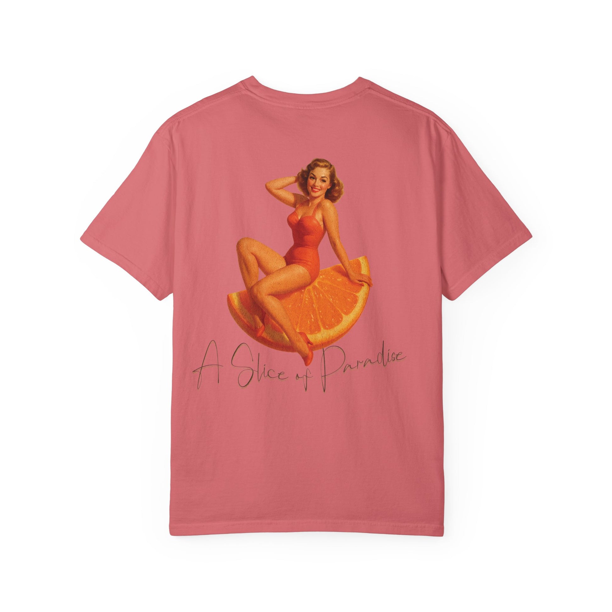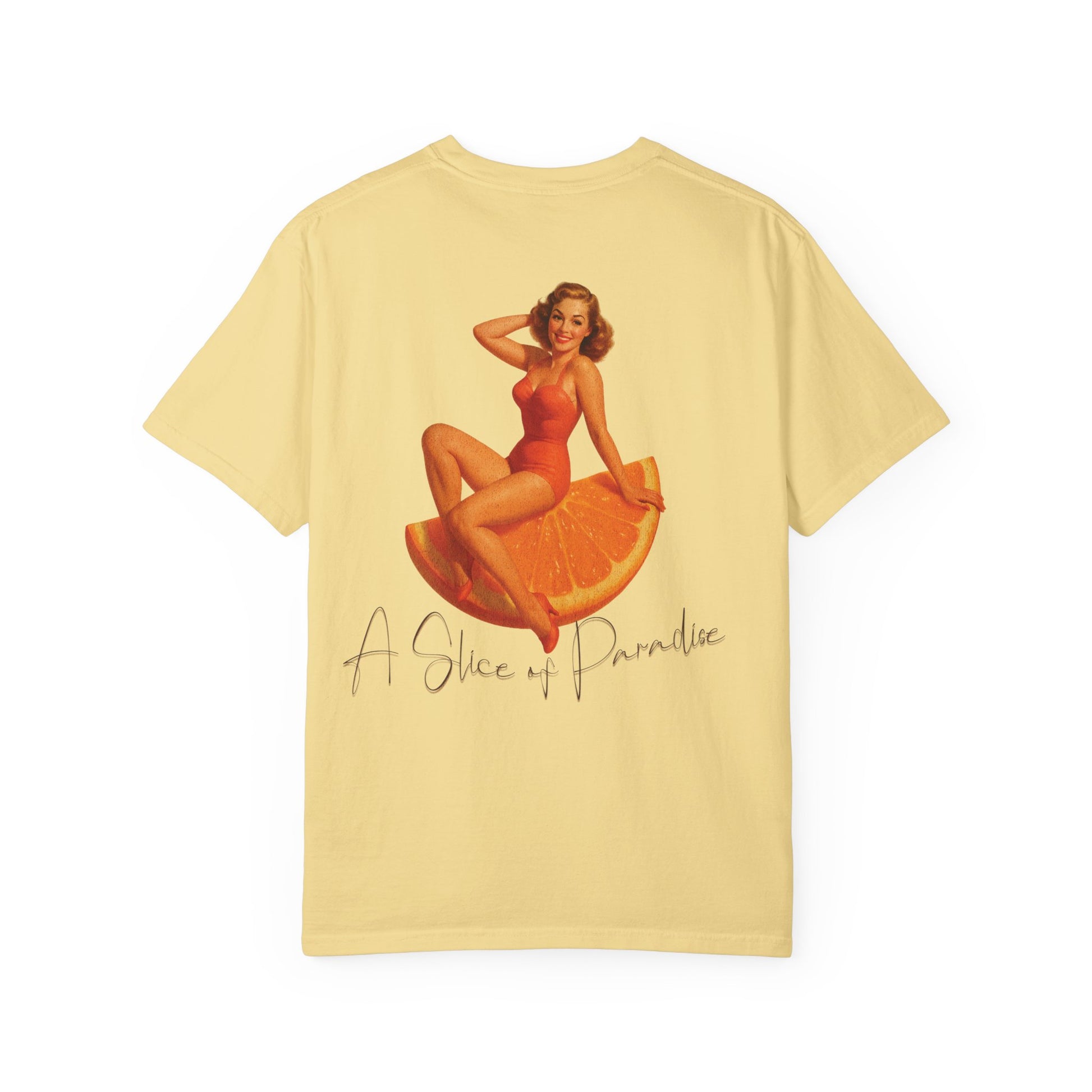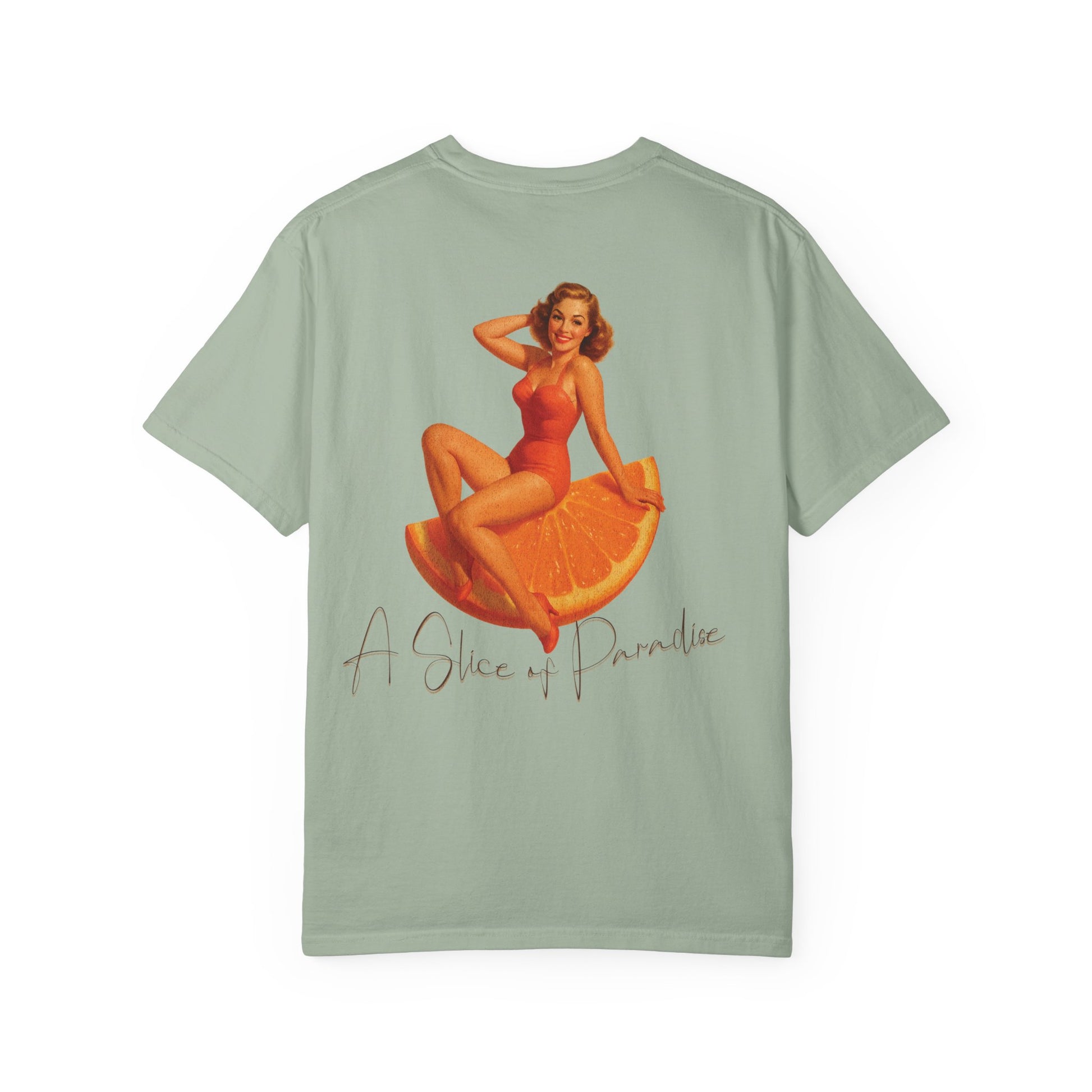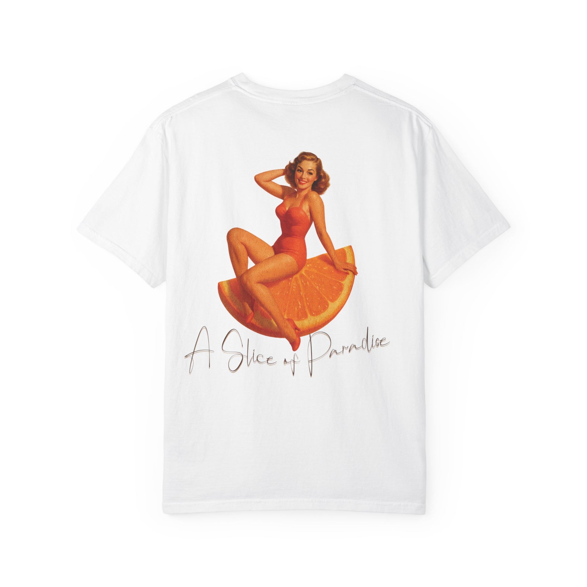 Step back into sunshine with the A Slice of Paradise Tee, the first release in our Florida Pinup Series. Inspired by classic Gil Elvgren pinup art, this design features a glamorous 1940s-style beauty lounging on an oversized orange slice β€” a playful nod to Old Florida charm with a splash of retro glam.
