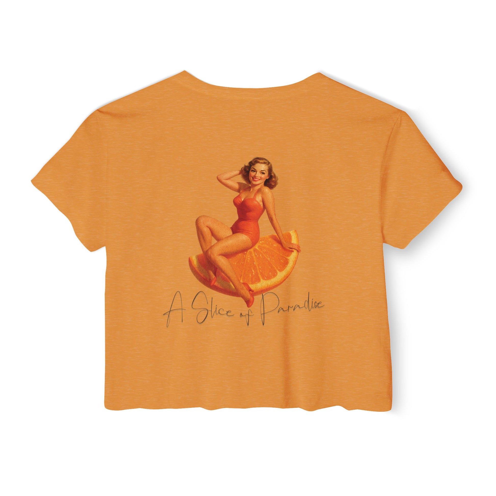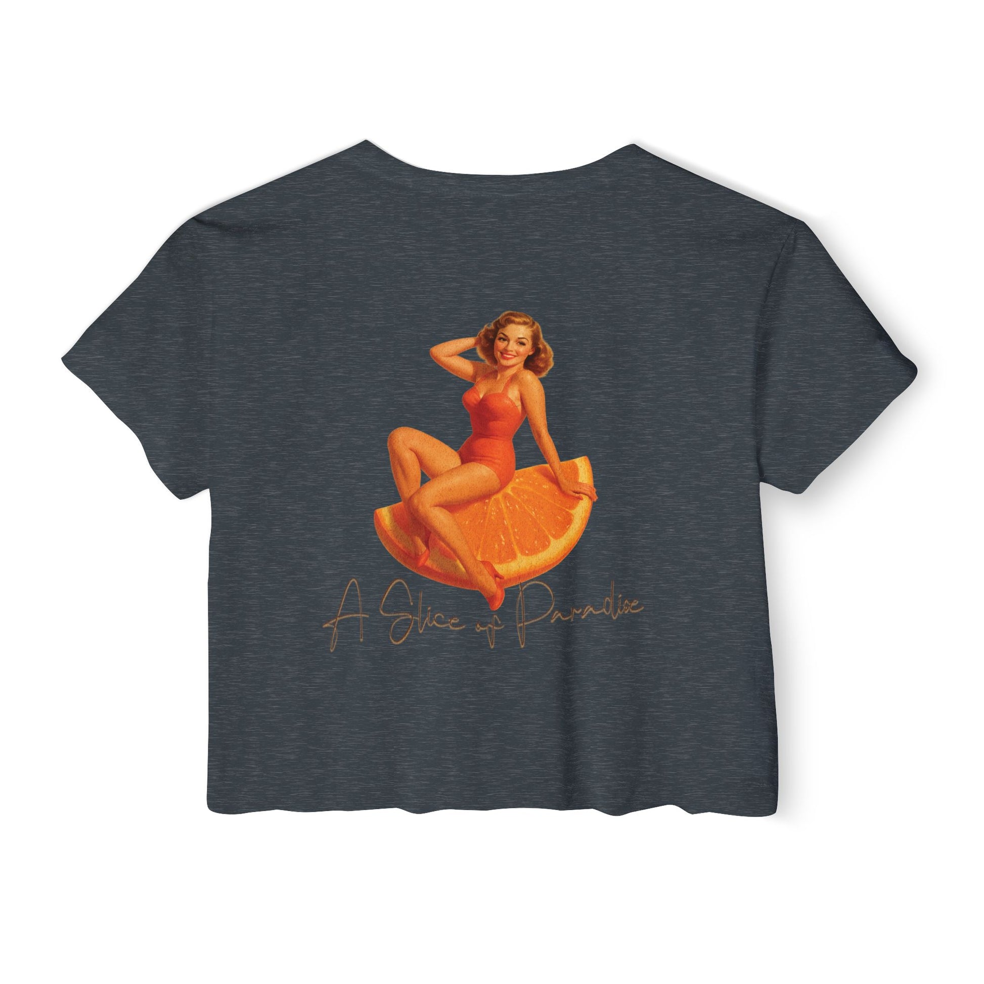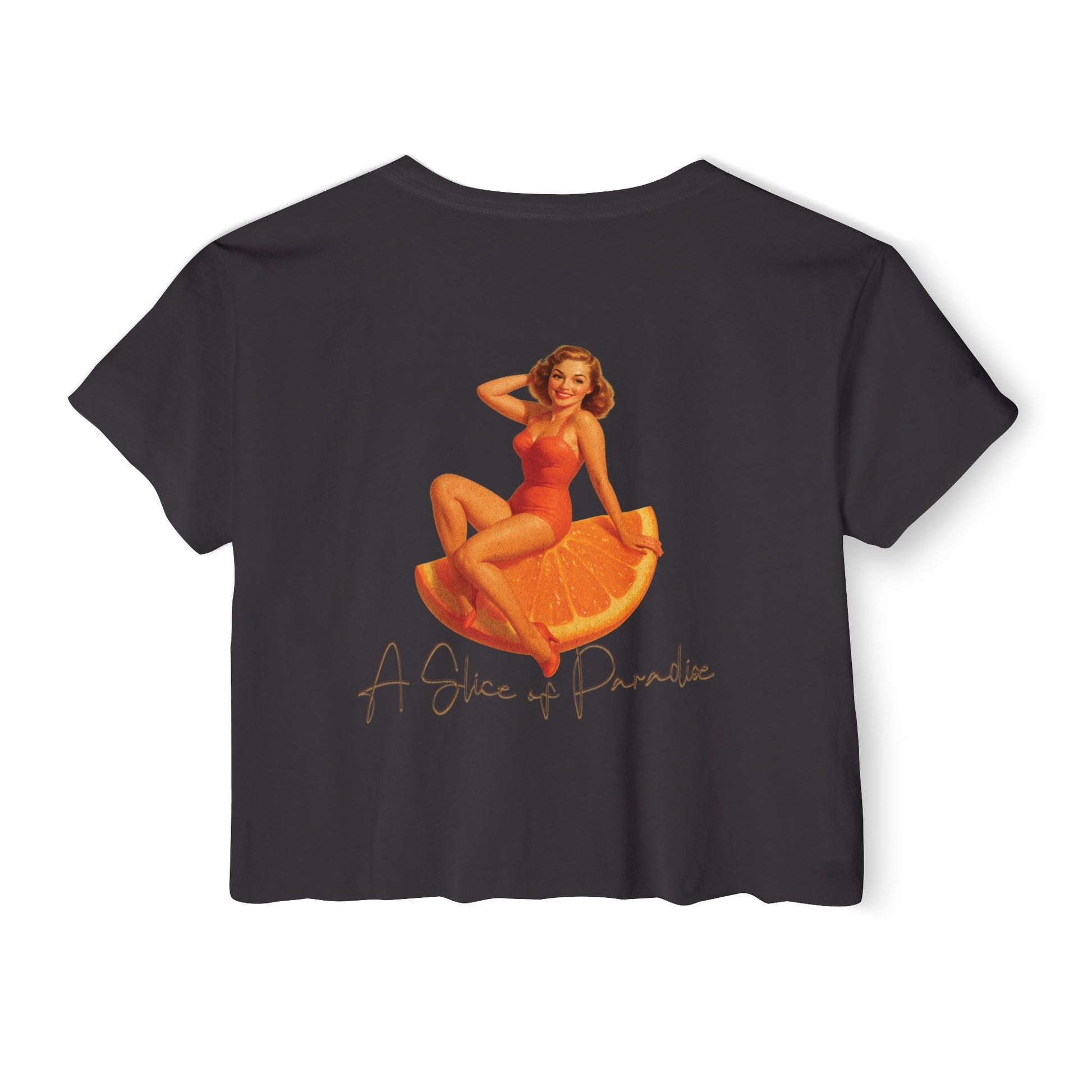 Bring a little retro sunshine into your wardrobe with the A Slice of Paradise Crop, part of our Florida Pinup Series. This vintage-inspired design features a glamorous 1940s-style beauty lounging on an oversized orange slice, paired with the tagline โA Slice of Paradise.โ Itโs cheeky, classic, and bursting with Old Florida charm.