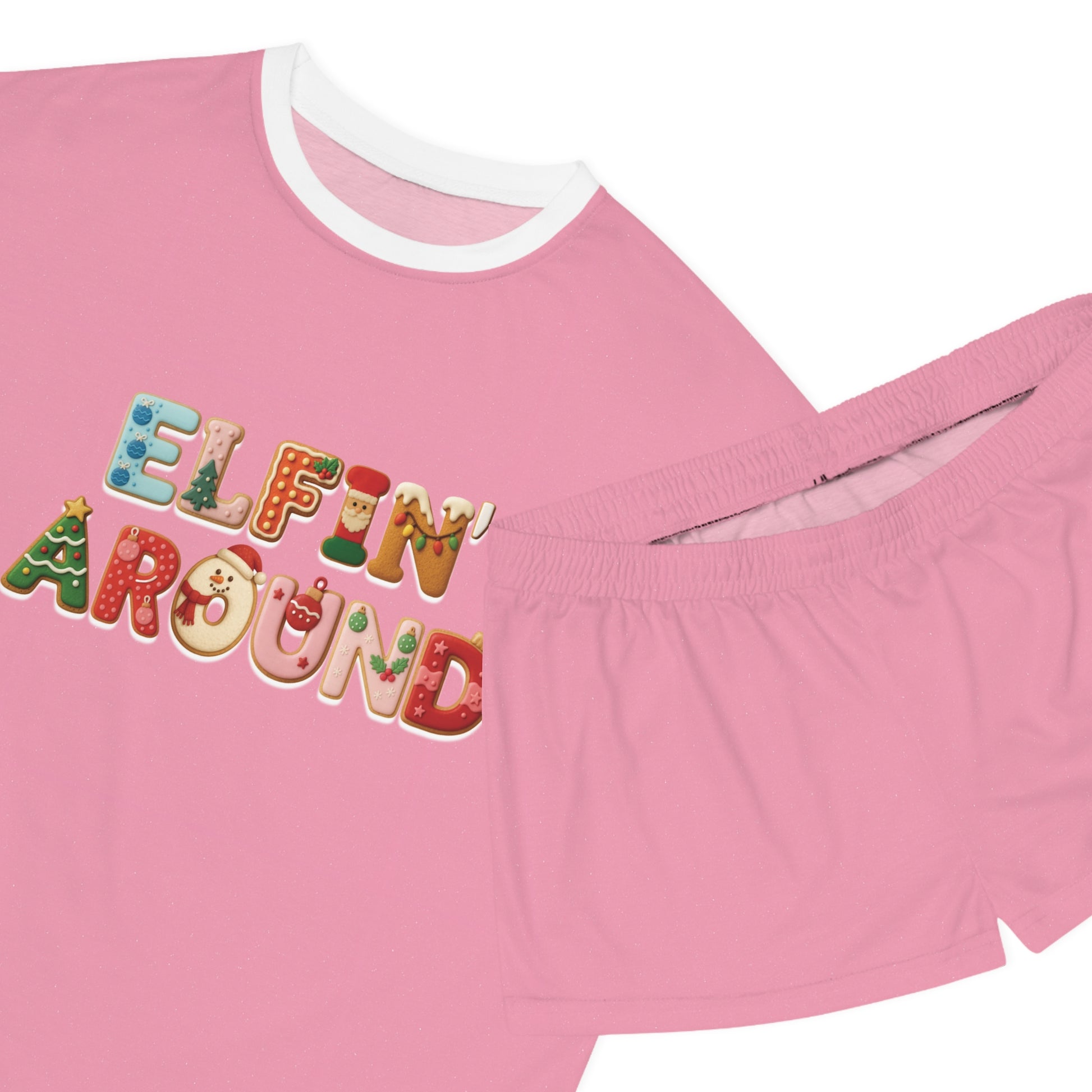 Get into festive mischief the comfy way with our Elfin’ Around Lounge Set. This adorable two-piece PJ set pairs a relaxed-fit top and matching shorts in the perfect peppermint-pink shade — topped off with our playful cookie-letter “Elfin’ Around” design. It’s sweet, cheeky, and guaranteed to become your go-to for holiday lounging, cookie baking, ornament hanging, and general elf-level chaos.