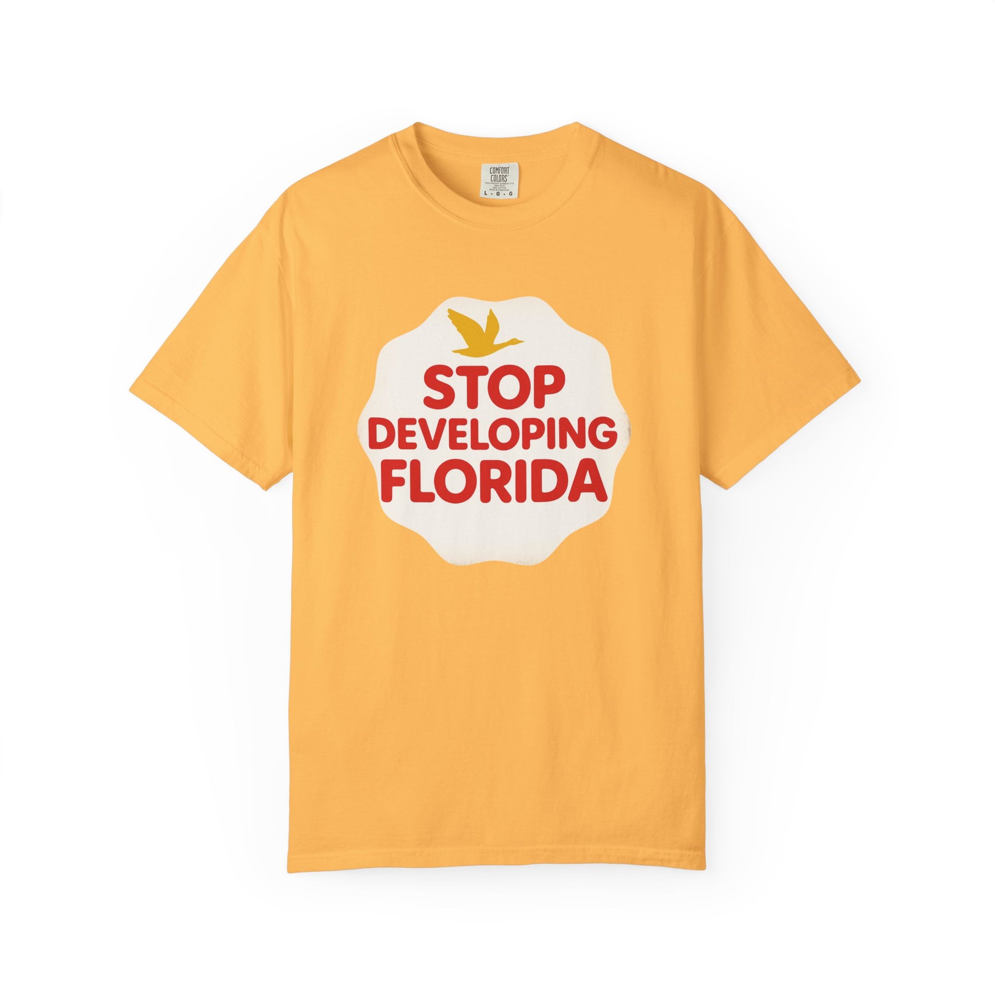 The front graphic features a golden bird in flight above a rounded cream badge with STOP DEVELOPING FLORIDA in bright red lettering. It’s friendly at a glance, but the message is loud and clear every time someone reads it.