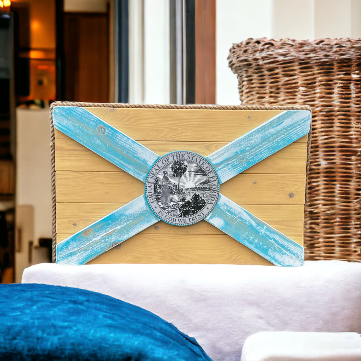 Understated, coastal, and unmistakably Florida. The Islamorada flag blends soft blue tones with natural wood for a look that feels relaxed, sun-worn, and intentional rather than decorative. It’s a quiet statement piece that works just as well in a home, office, or covered outdoor space.