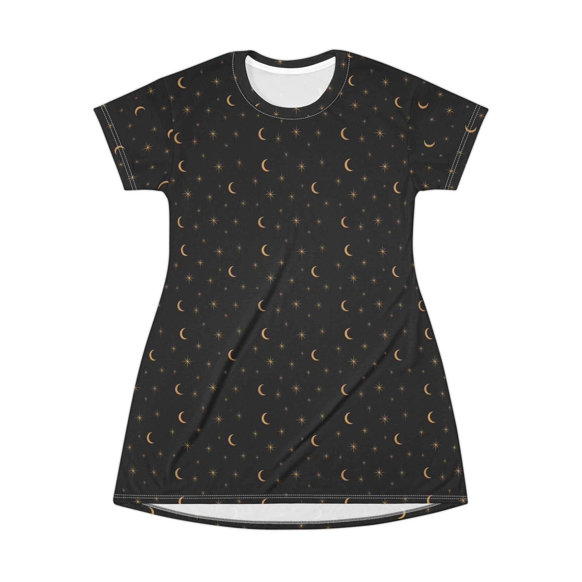 Step into soft celestial comfort with the Midnight Stardust Lounge Dress, wrapped in our signature Midnight Stardust pattern — golden stars and crescent moons scattered across a deep, velvety black. Silky, lightweight, and incredibly comfortable, this t-shirt–style lounge dress is perfect for cozy nights in, slow mornings, or year-round stargazing from the couch.