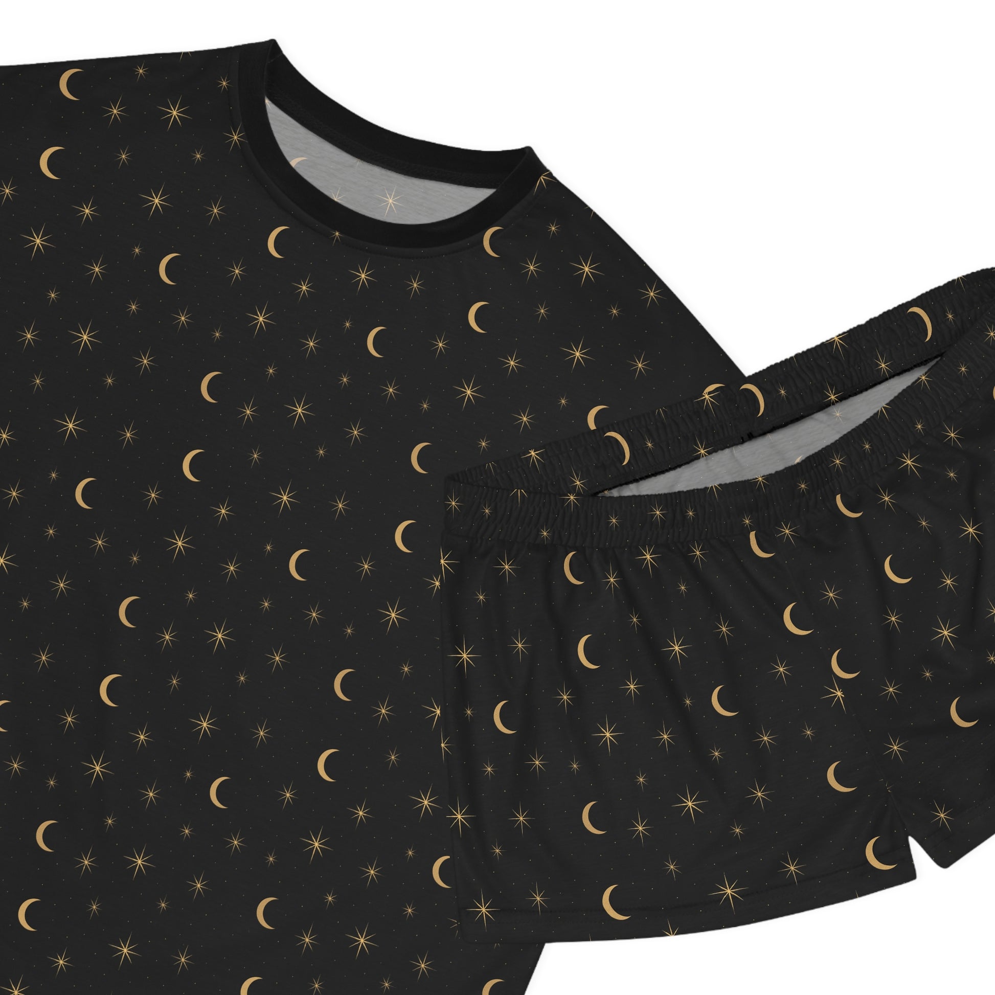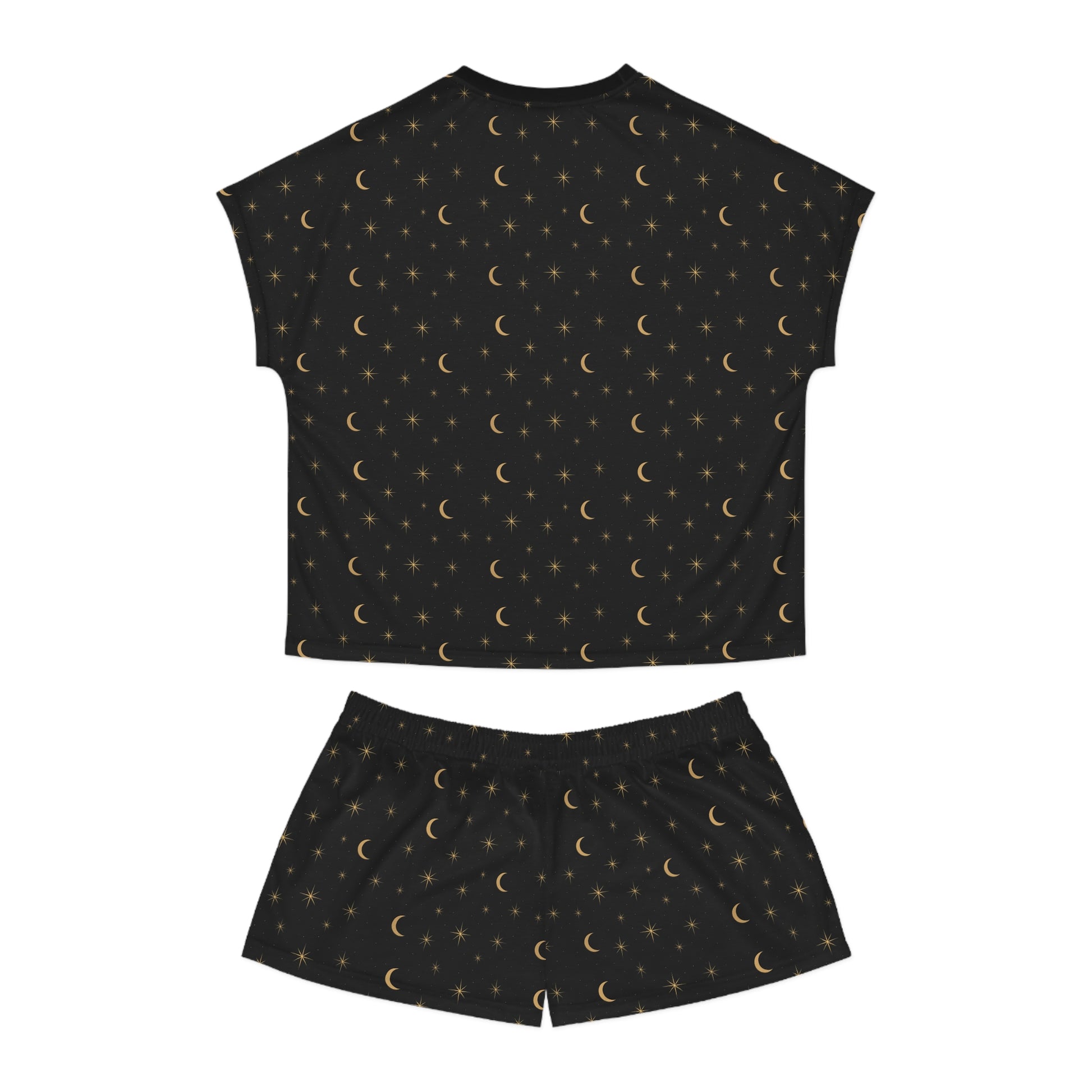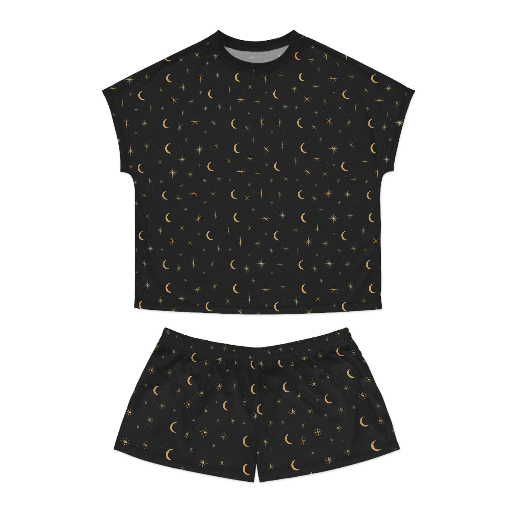 Slip into celestial comfort with the Midnight Stardust Lounge Set — a moody, luxurious two-piece kissed with golden stars and crescent moons drifting across a deep velvet-black base. Designed to feel silky, lightweight, and effortlessly soft, this set brings quiet holiday magic with a high-end, boutique feel that works year-round.