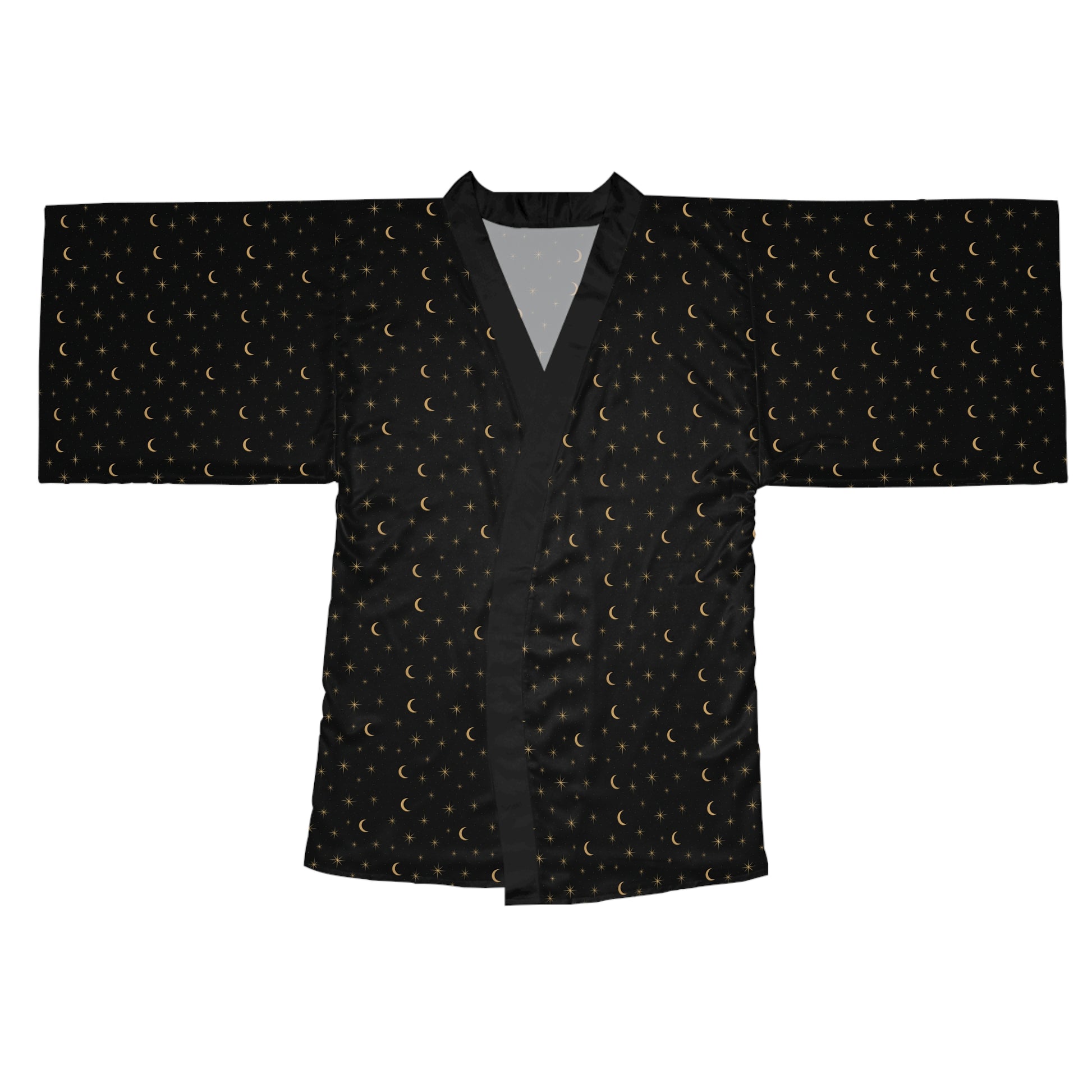 Wrap yourself in moonlit luxury with the Midnight Stardust Satin Kimono Robe. Drenched in our inky-black Midnight Stardust pattern — tiny golden stars and crescent moons floating across a velvety night-sky base — this lightweight robe brings a touch of celestial drama to your everyday routine. It’s breezy, elegant, and perfect for slow mornings, post-shower pampering, getting ready for a night out, or winding down under twinkle lights.