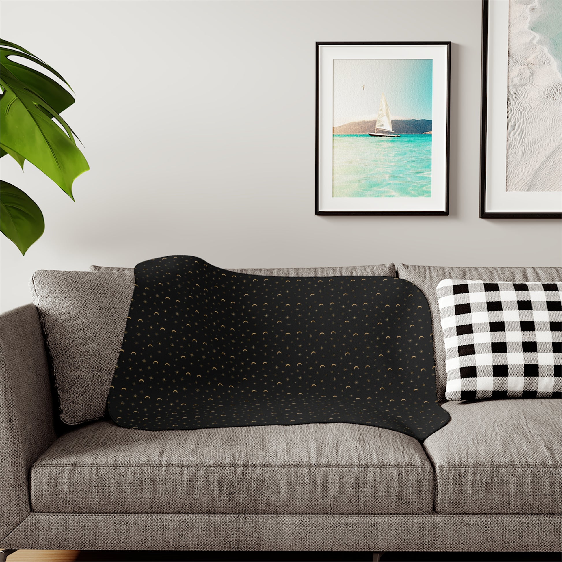 Wrap yourself in celestial coziness with the Midnight Stardust Sherpa Throw Blanket. Golden stars and crescent moons drift across a deep, velvety-black sky on the smooth printed front, while the ultra-plush sherpa backing delivers cloud-like warmth. It’s moody, magical, and perfect for cozy nights, holiday movies, or gifting to anyone who loves a little luxe stargazer energy.
