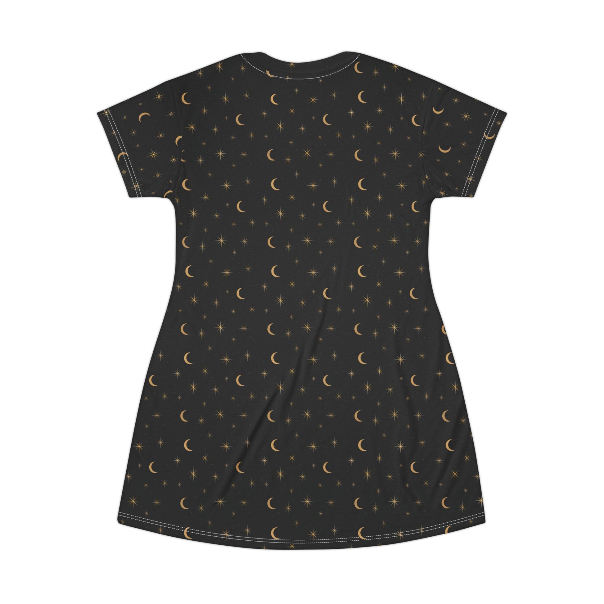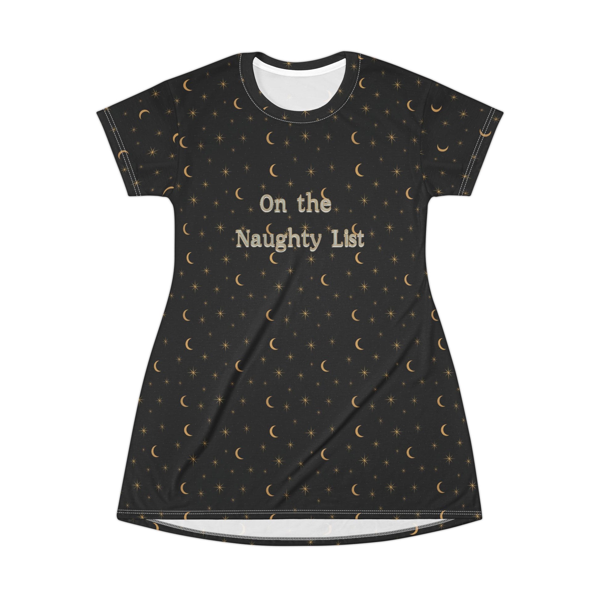 Step into soft holiday mischief with the On the Naughty List Lounge Dress, wrapped in our Midnight Stardust pattern — golden stars and crescent moons scattered across a deep, velvety black. Silky, lightweight, and incredibly comfortable, this t-shirt–style lounge dress is perfect for cozy nights in, late-night movie marathons, or snapping playful “Naughty List” selfies by the tree.