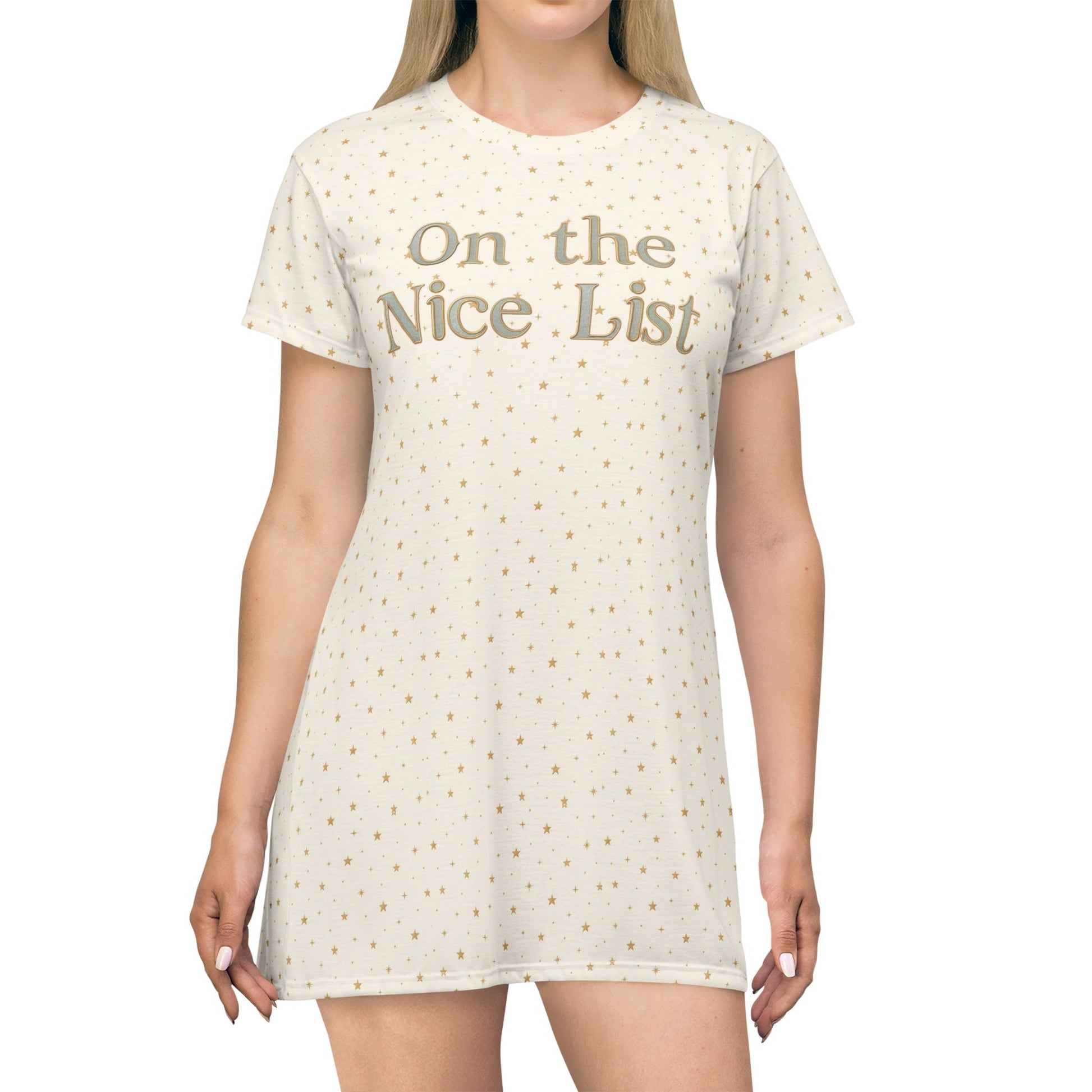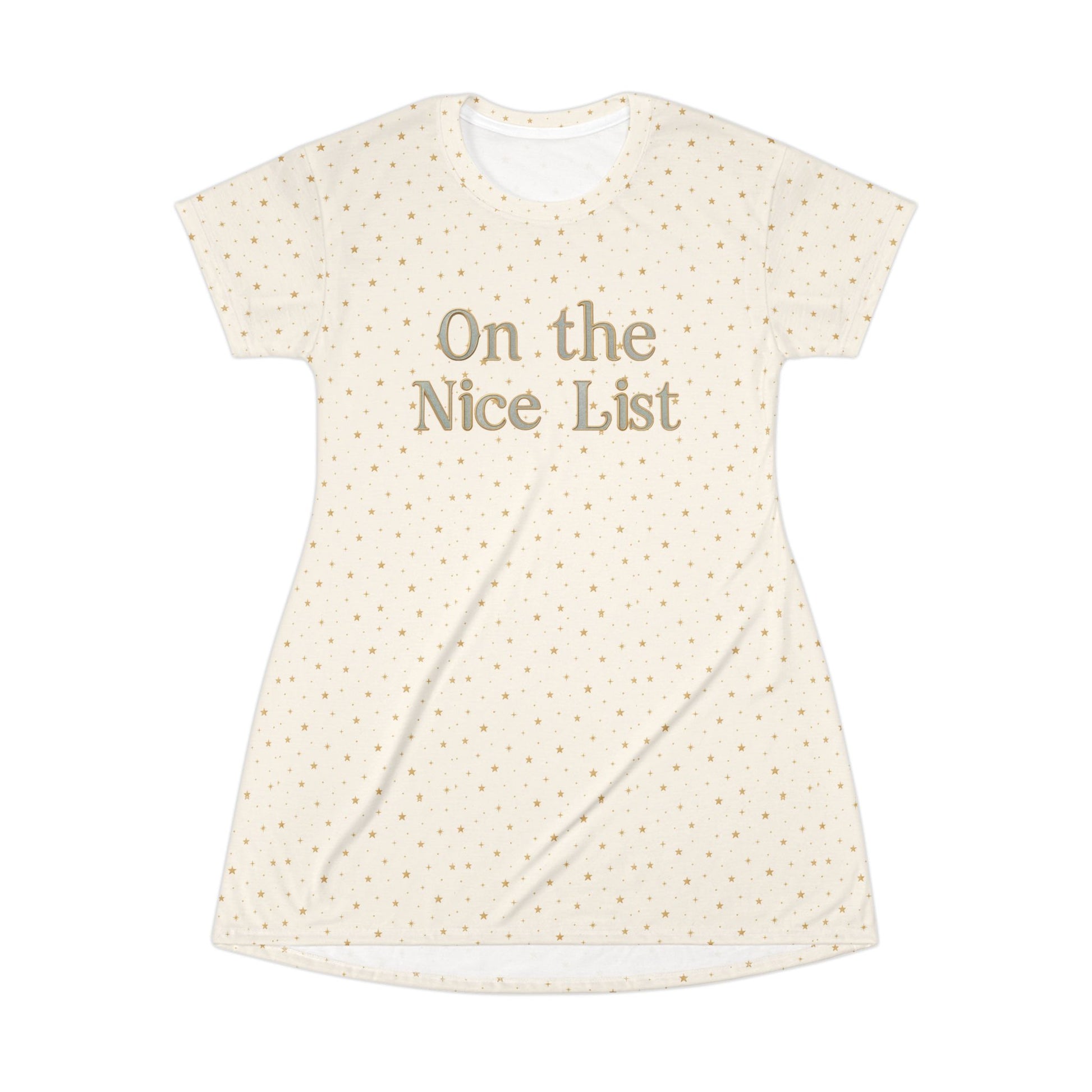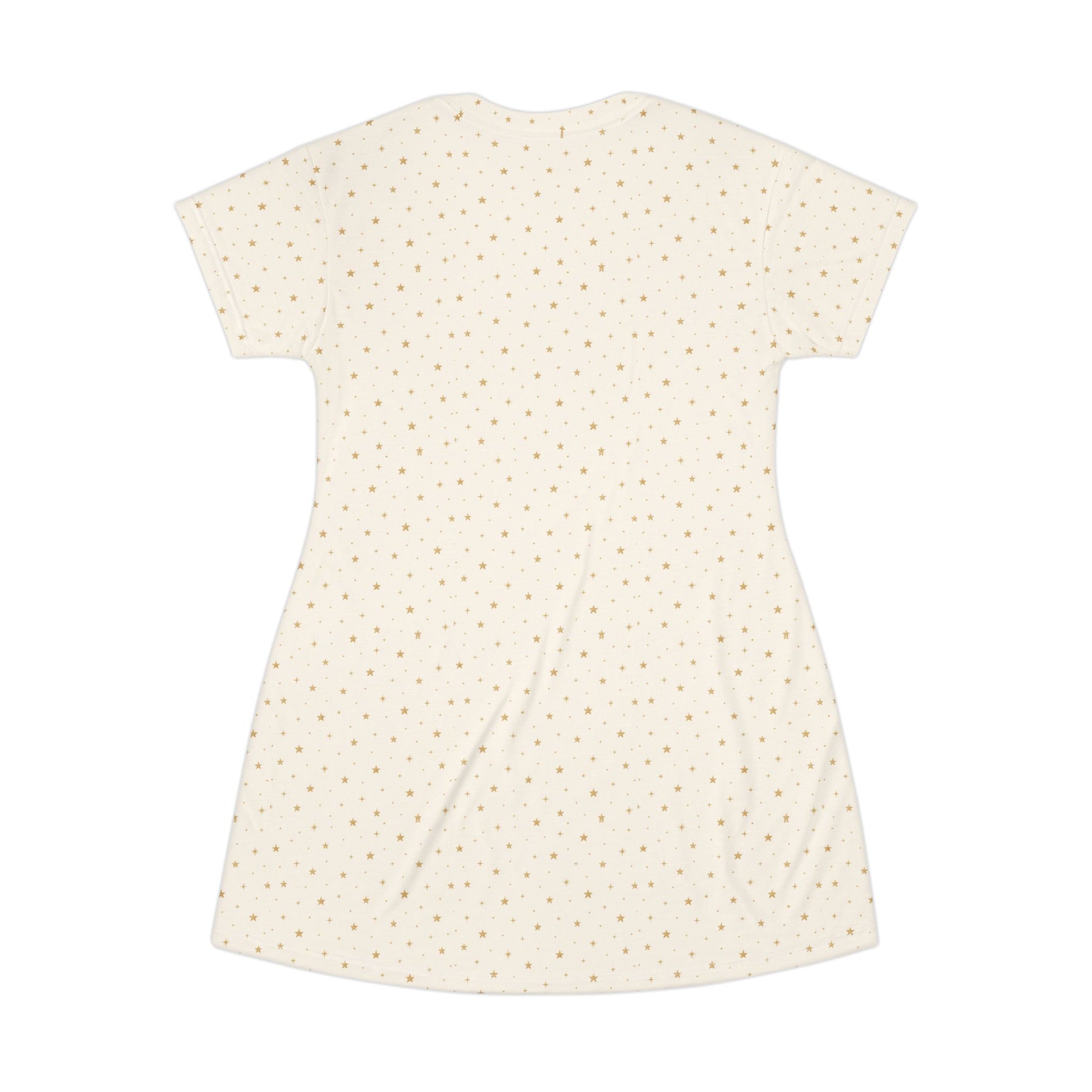 Step into soft holiday magic with the On the Nice List Lounge Dress, wrapped in our elegant Stardust pattern — tiny golden stars floating across a warm ivory cream base. Lightweight, silky, and incredibly comfortable, this t-shirt–style lounge dress is perfect for cozy nights, festive mornings, or gifting season selfies.