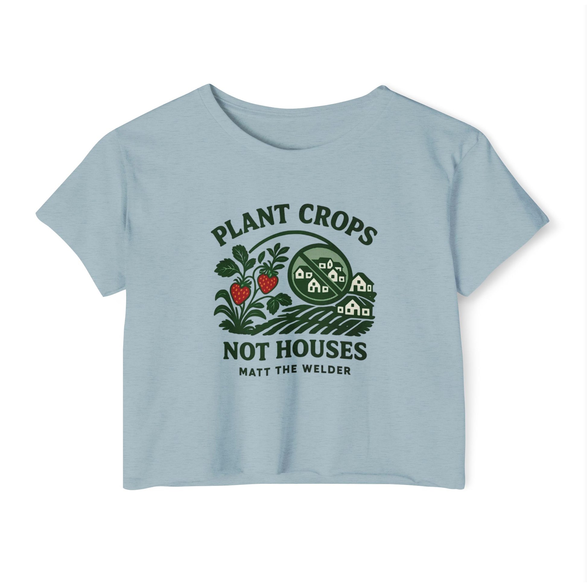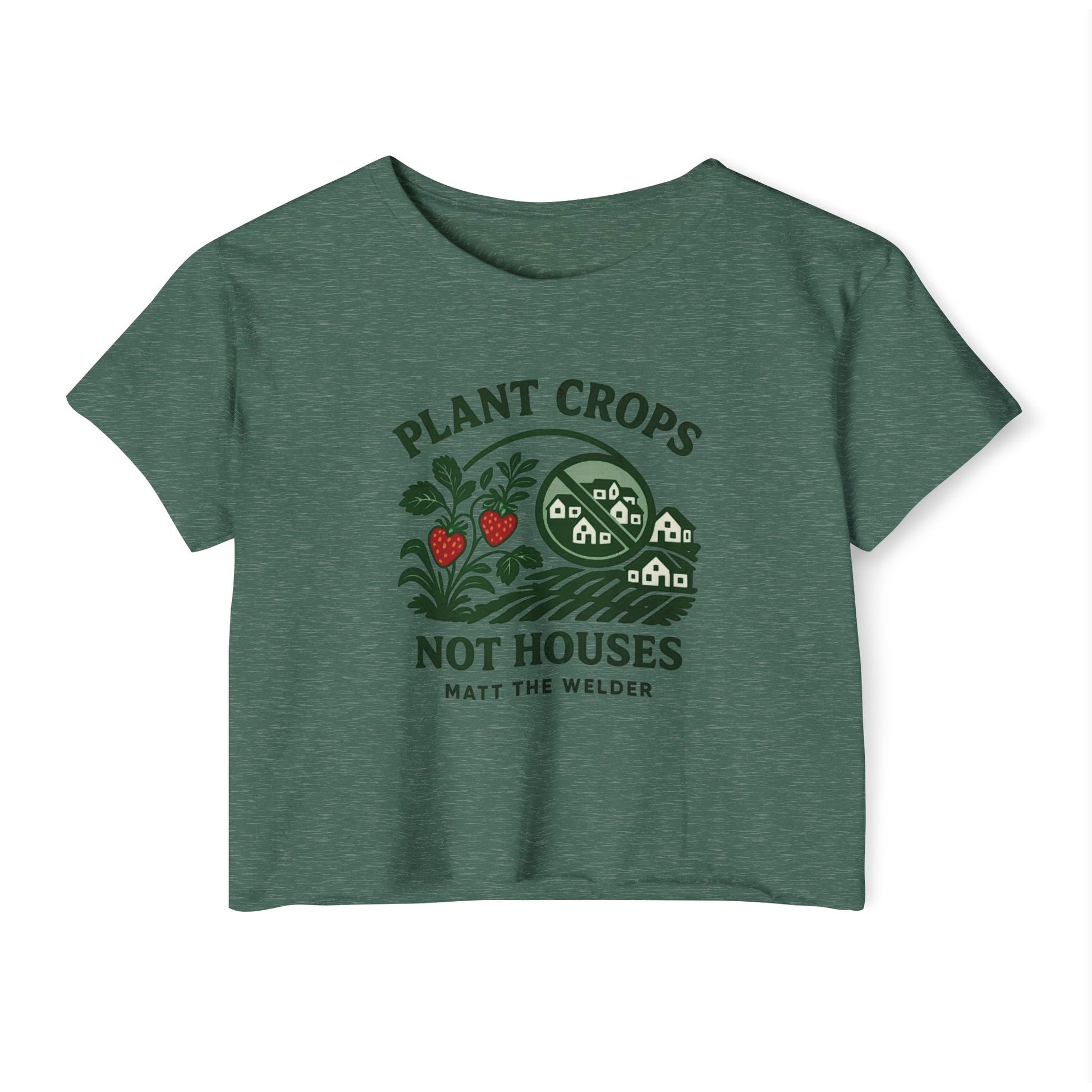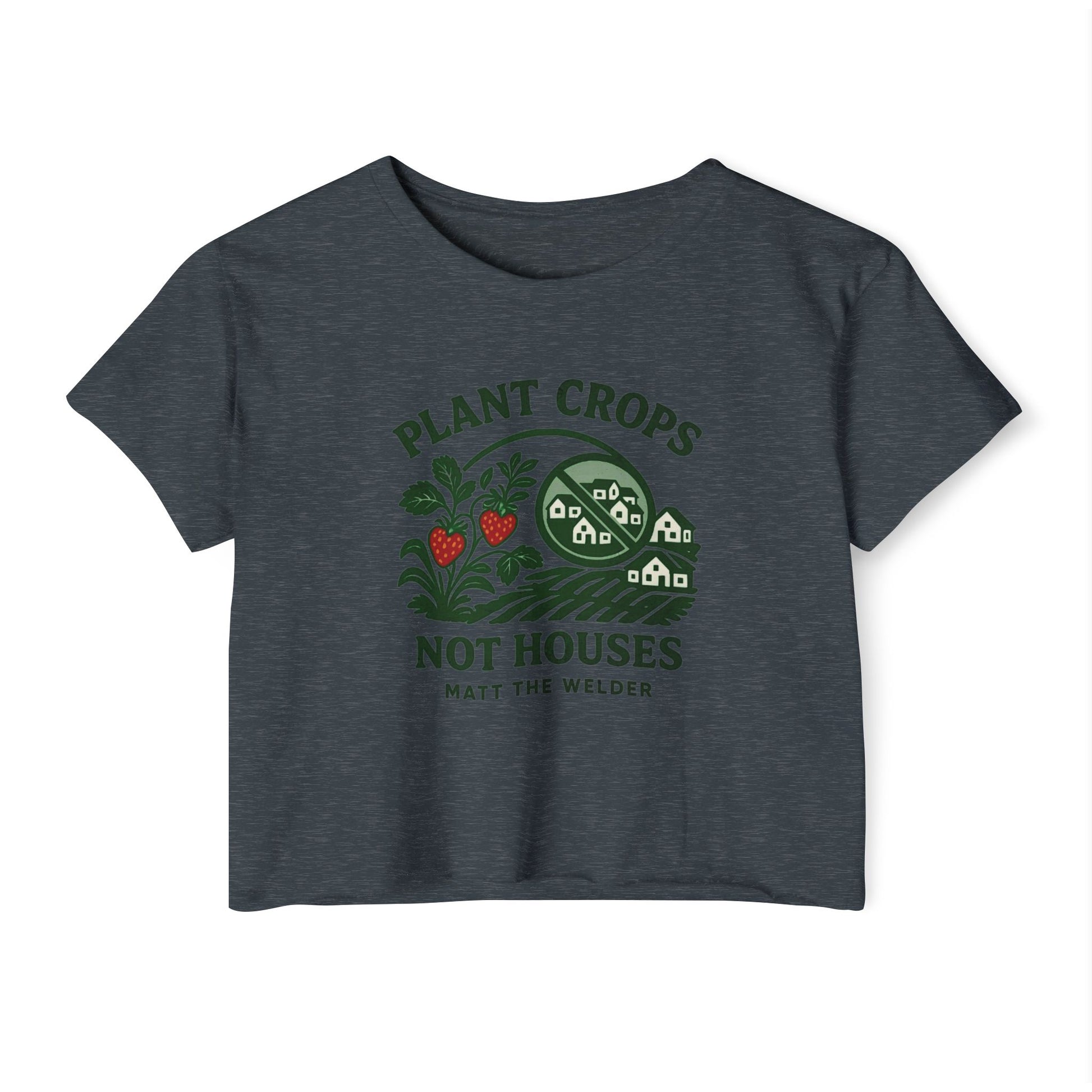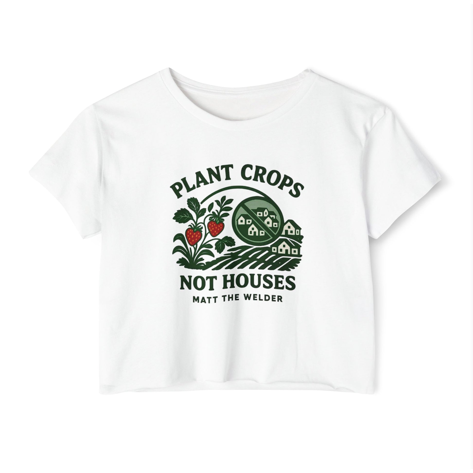 The Plant Crops, Not Houses Crop Tee from Matt the Welder keeps the message clear and the fit fresh—protect farmland, not subdivisions. Featuring bold green artwork with strawberries and fields, this cropped version brings Real Florida values to a modern silhouette that’s equal parts soft, strong, and statement-making.