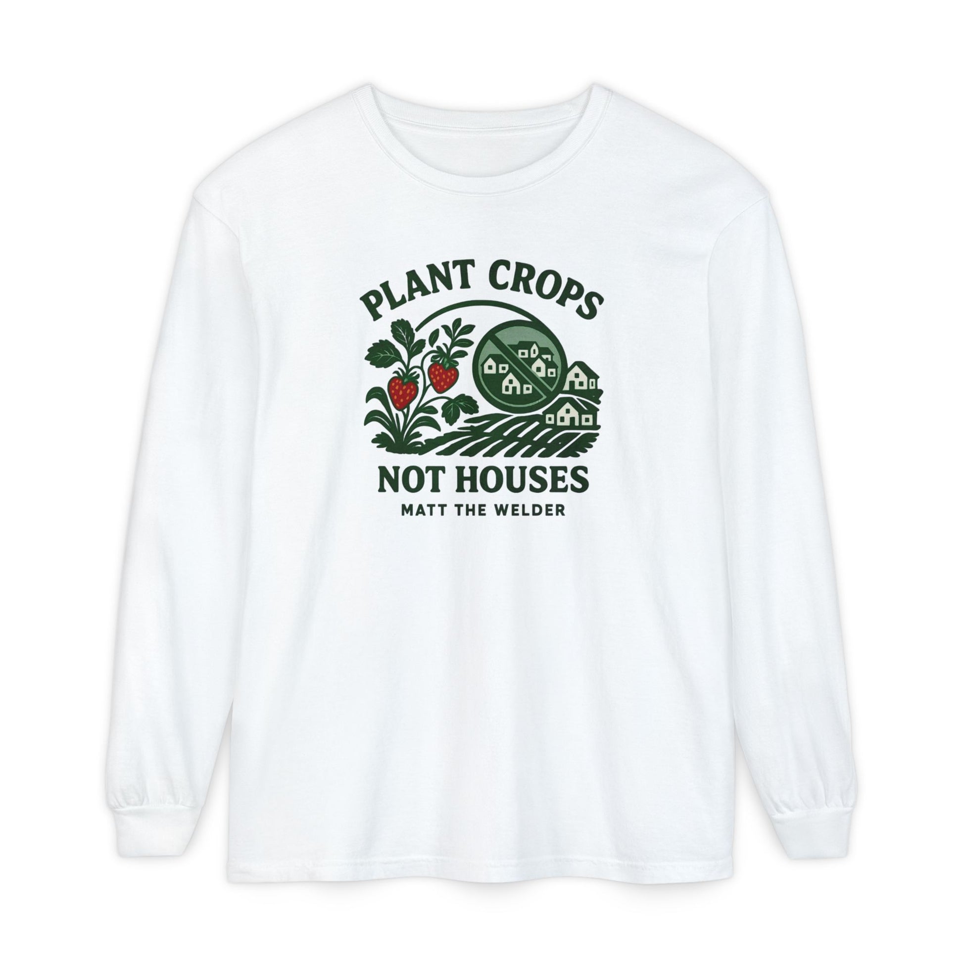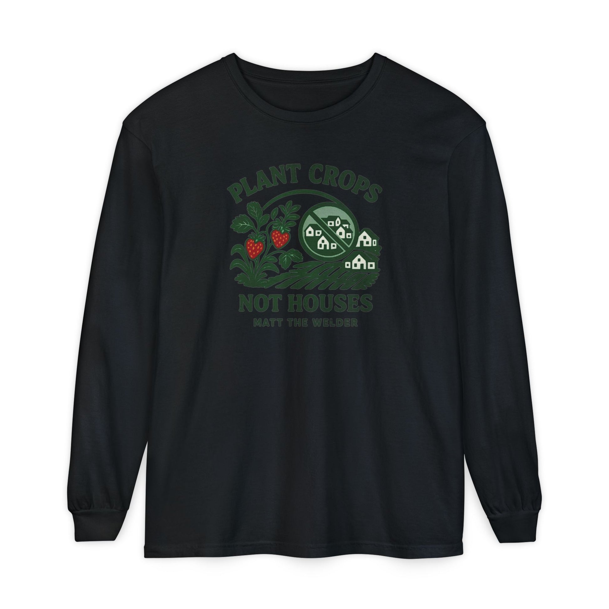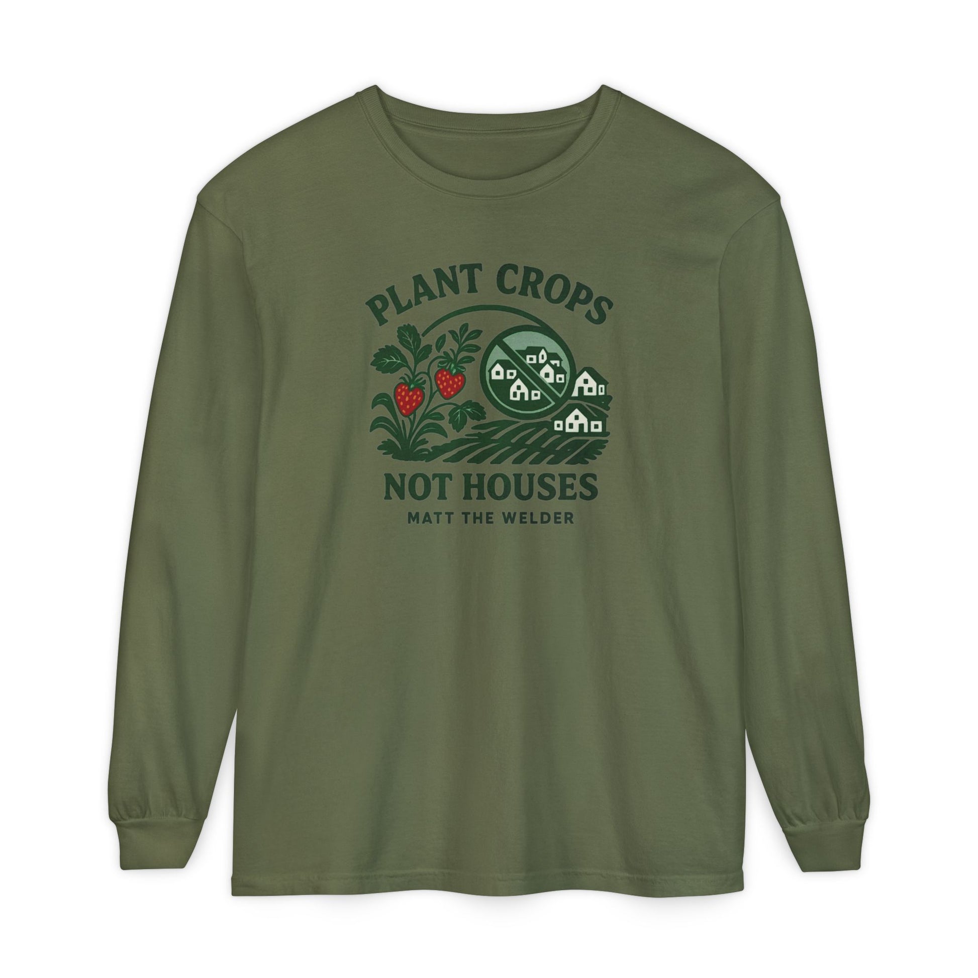 The Plant Crops, Not Houses Long Sleeve Tee from Matt the Welder makes a statement that runs deeper than the soil—protect farmland, not subdivisions. Featuring bold green artwork with strawberries and homesteads, it’s built for those who get their hands dirty defending Real Florida, just like Matt.