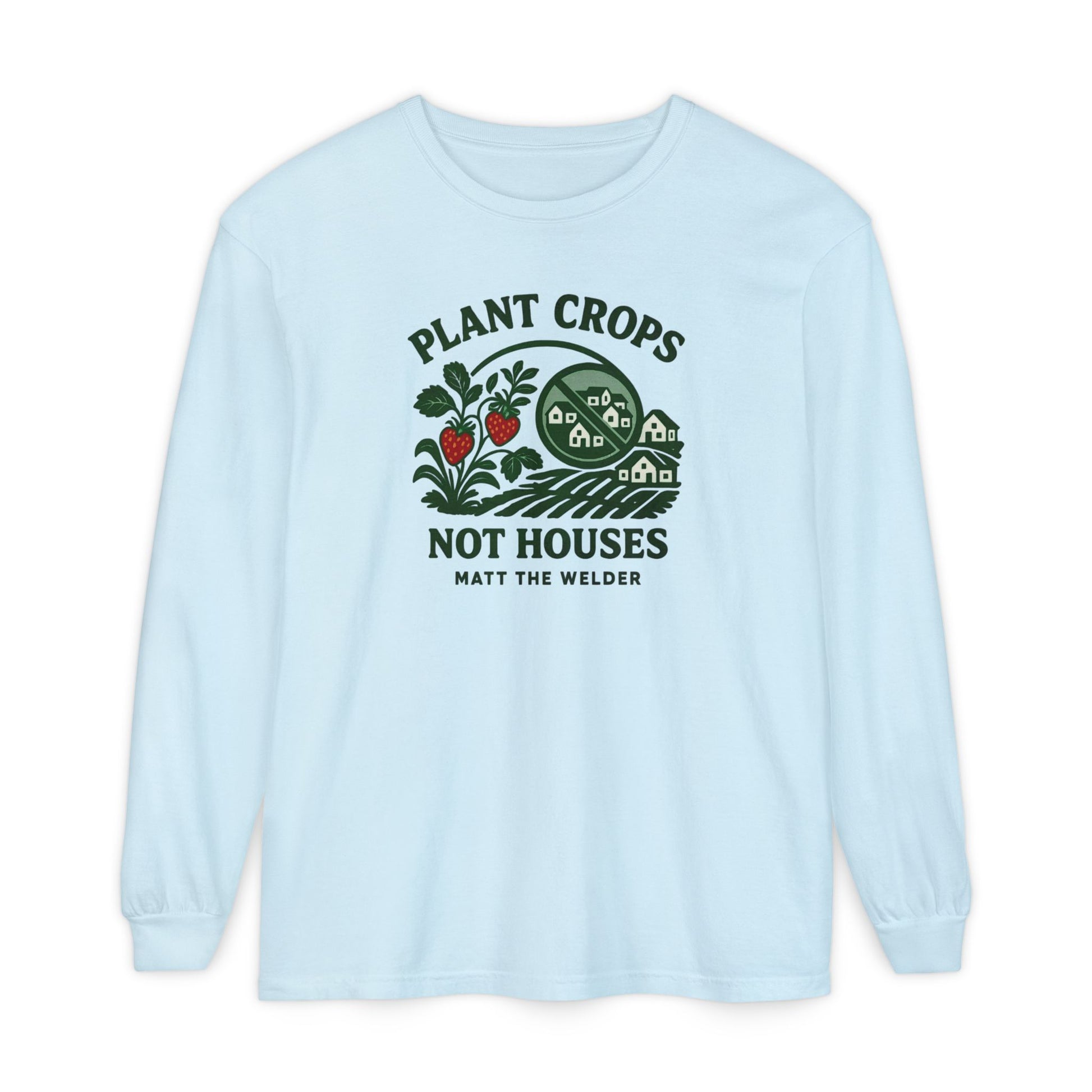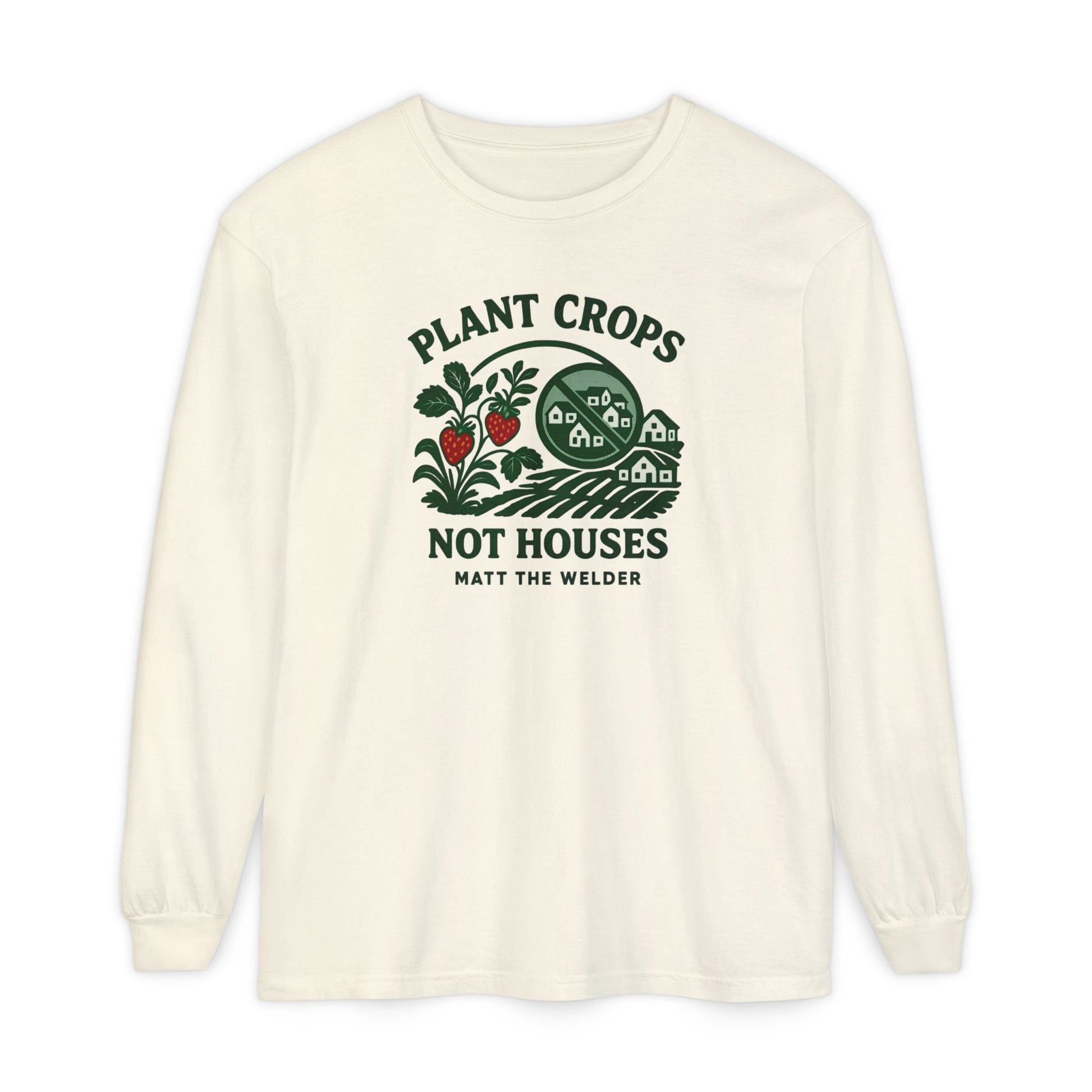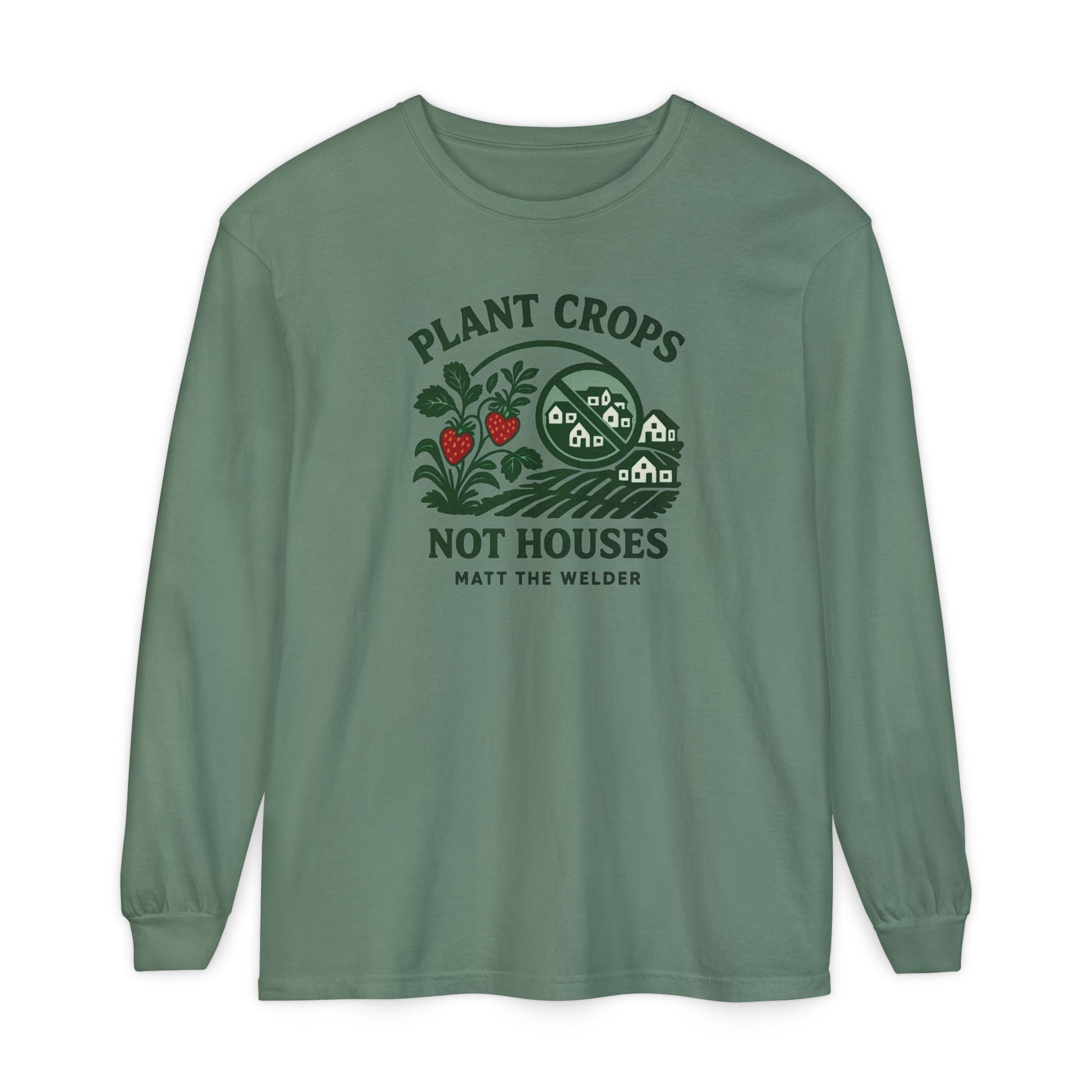 The Plant Crops, Not Houses Long Sleeve Tee from Matt the Welder makes a statement that runs deeper than the soil—protect farmland, not subdivisions. Featuring bold green artwork with strawberries and homesteads, it’s built for those who get their hands dirty defending Real Florida, just like Matt.