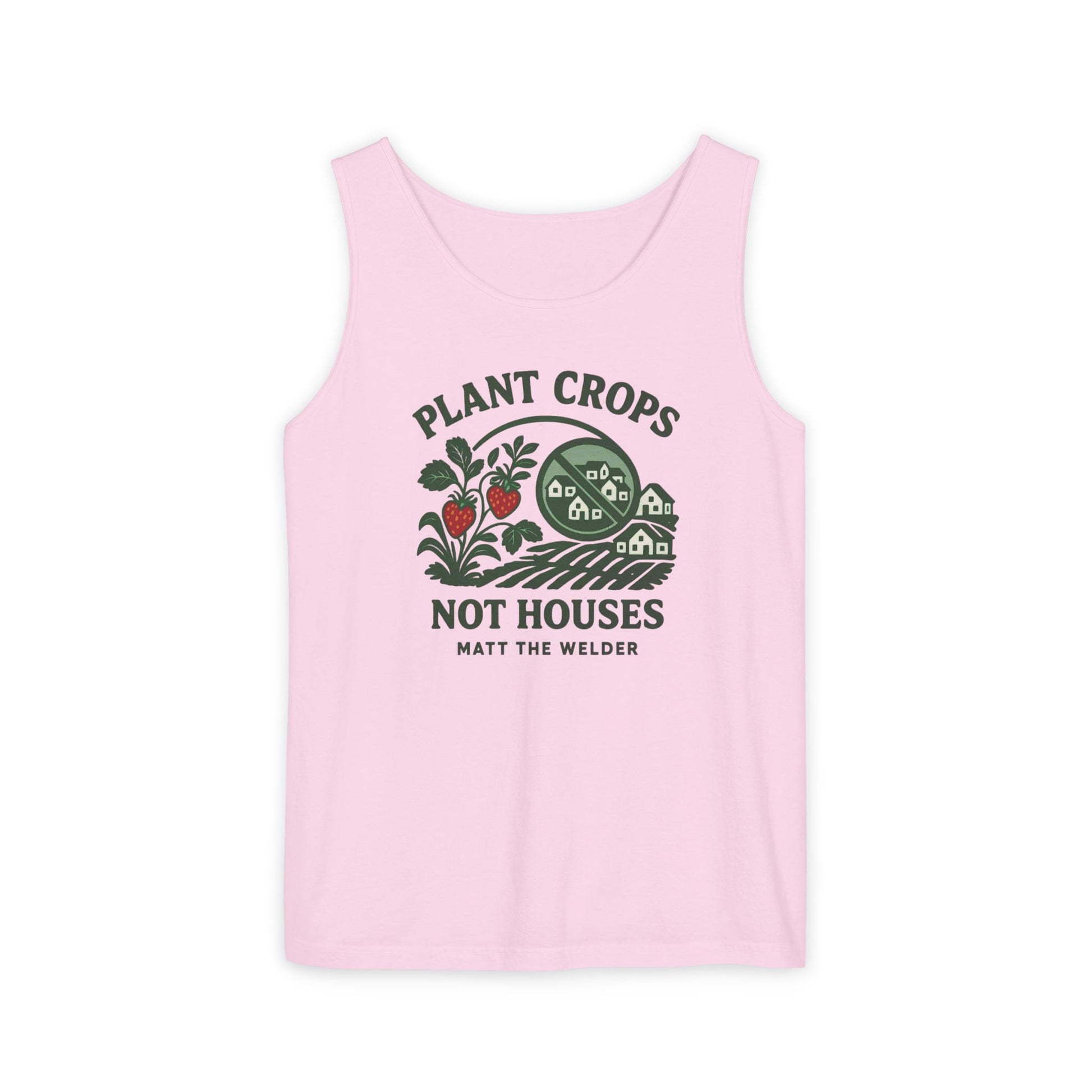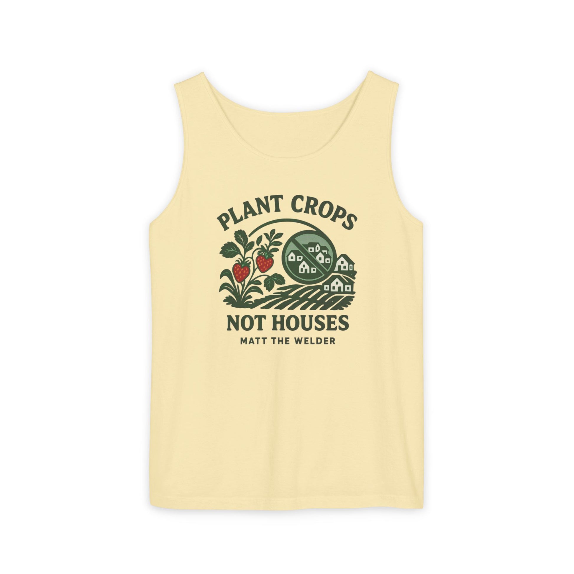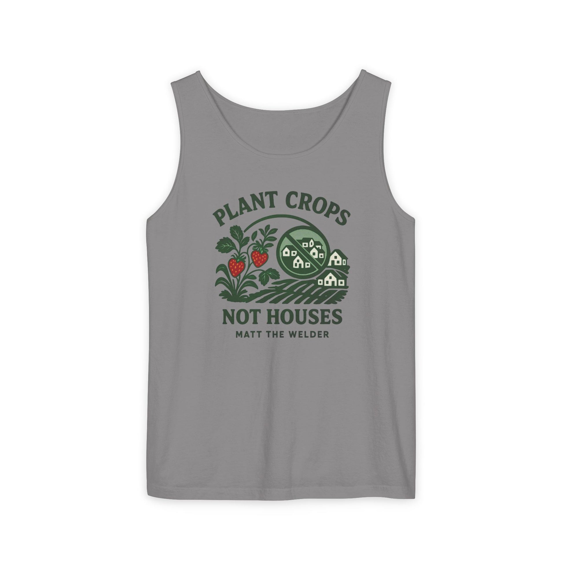 The Plant Crops, Not Houses Tank from Matt the Welder keeps it cool while keeping it real—protect farmland, not subdivisions. Featuring bold green artwork with strawberries and fields, this laid-back staple brings Real Florida spirit to long summer days and honest work.