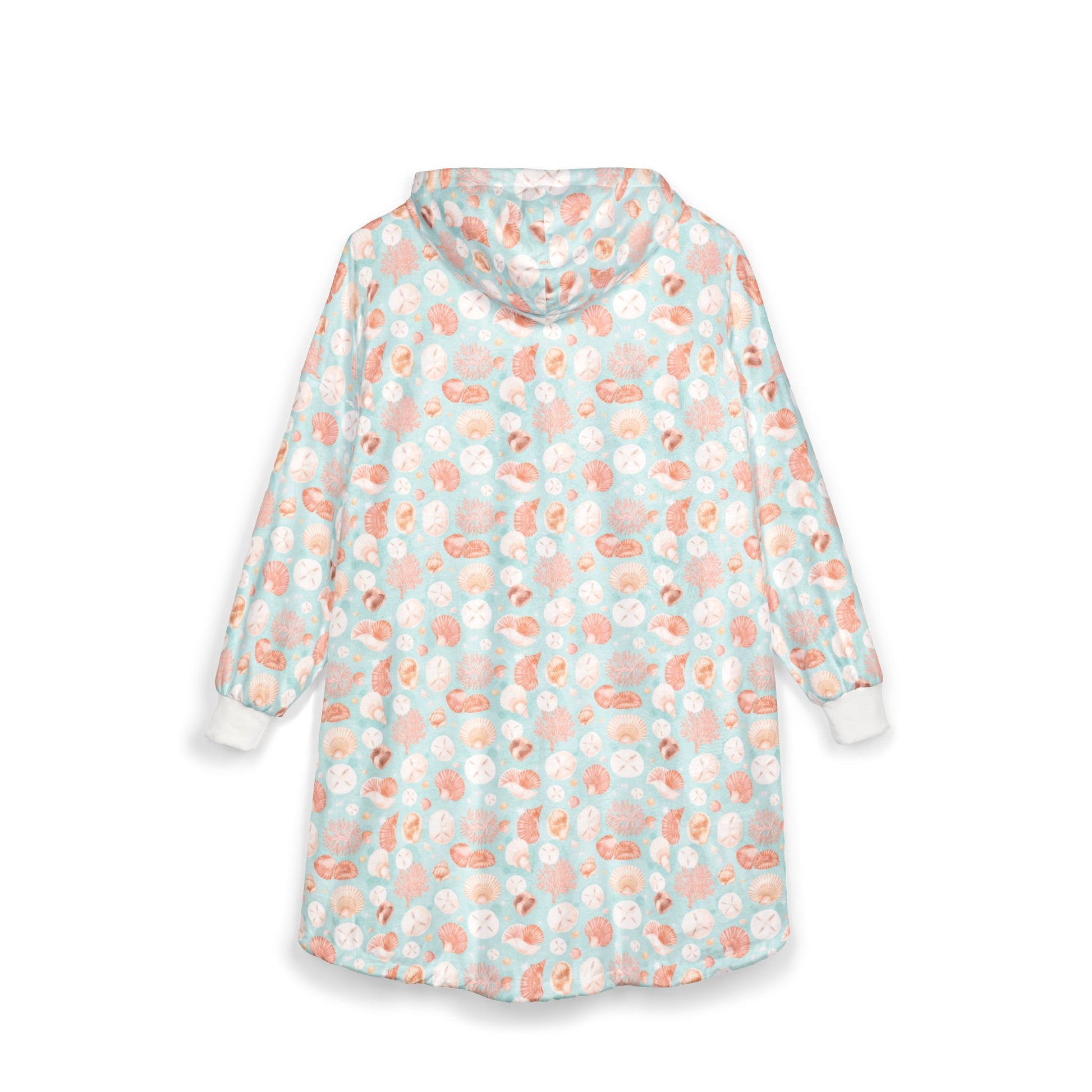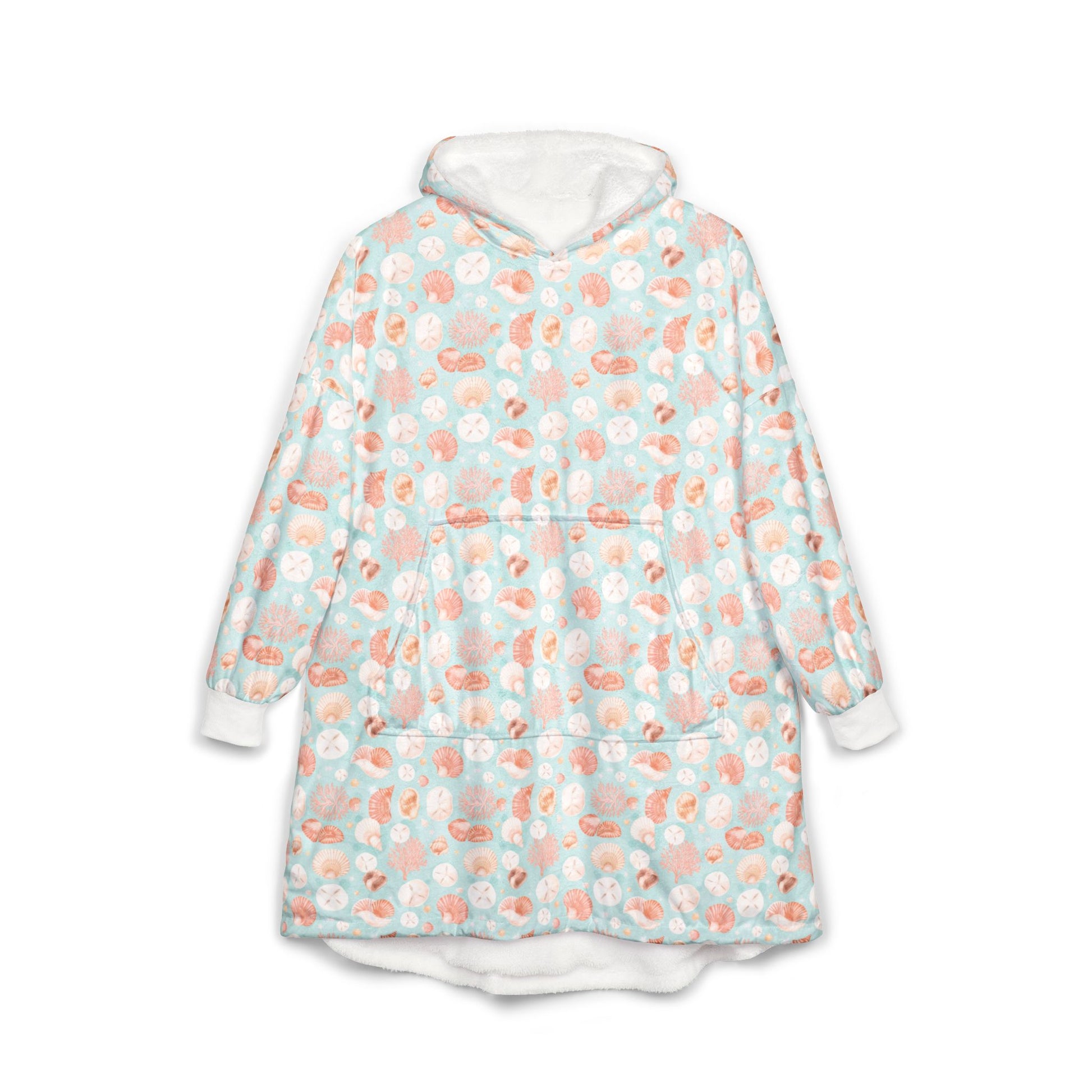 Wrap yourself in shoreline calm with the Seafoam Serenade Hooded Blanket. This oversized, one-size-fits-all hoodie blanket is peak cozy — adorned with watercolor seashells, sand dollars, and coral fans drifting over a sea-glass backdrop. Perfect for lounging, movie nights, or slow mornings, it feels like a soft ocean breeze you can wear.