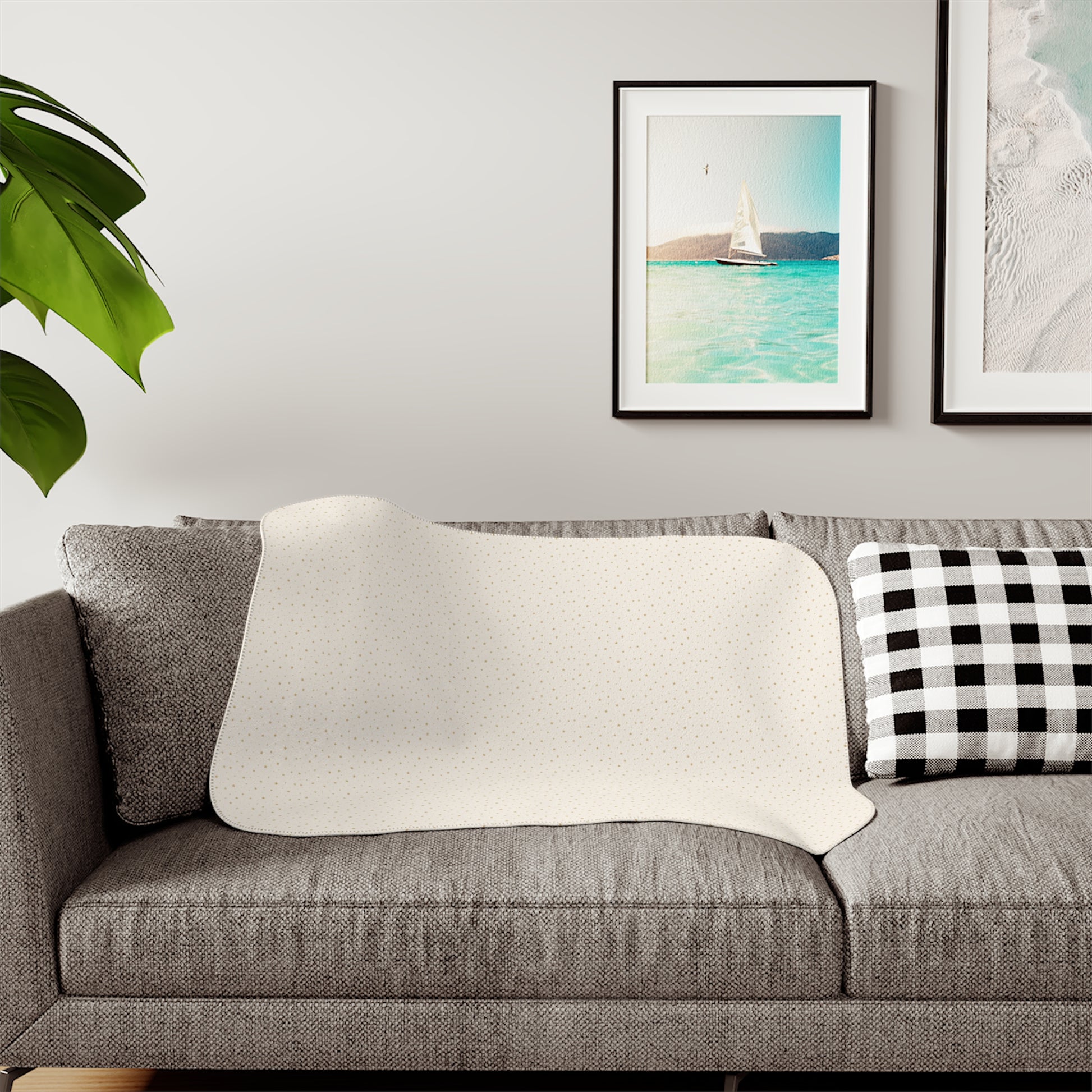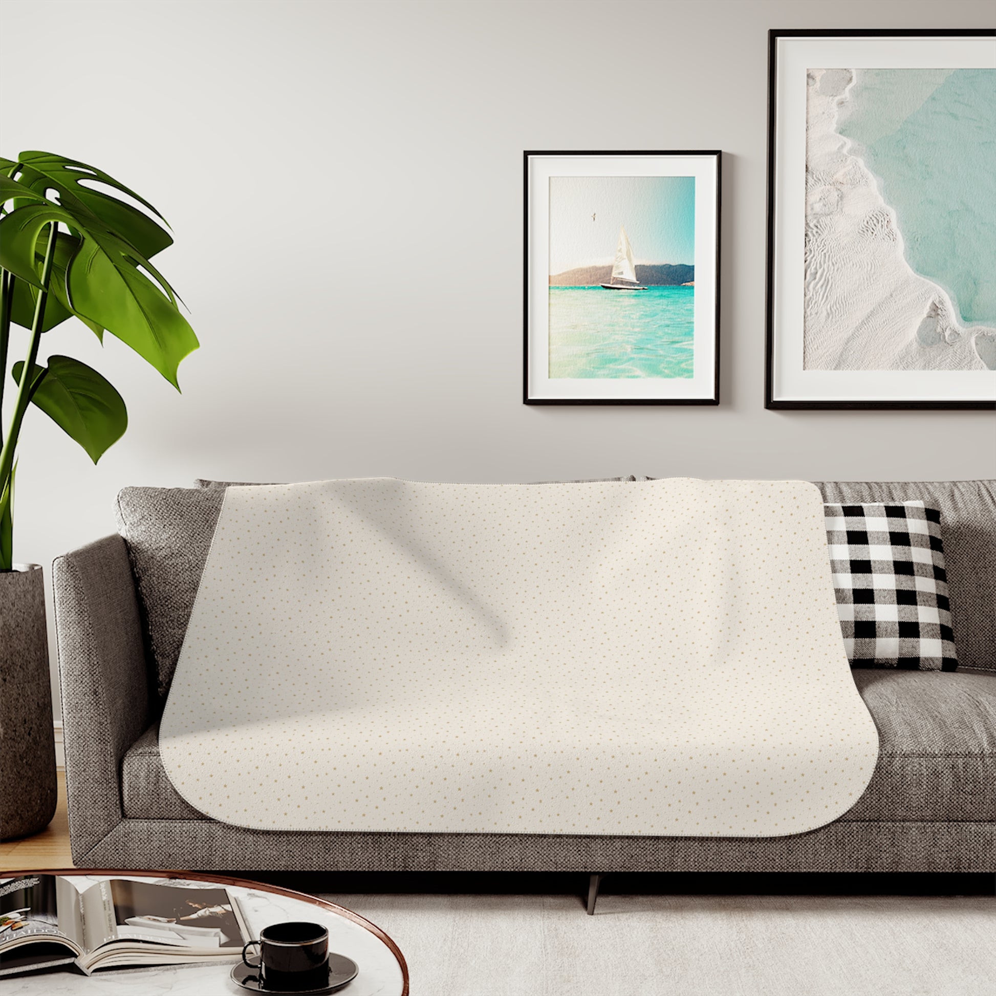 🏡 Front: printed Stardust pattern | Back: choice of Beige or Gray sherpa fleece