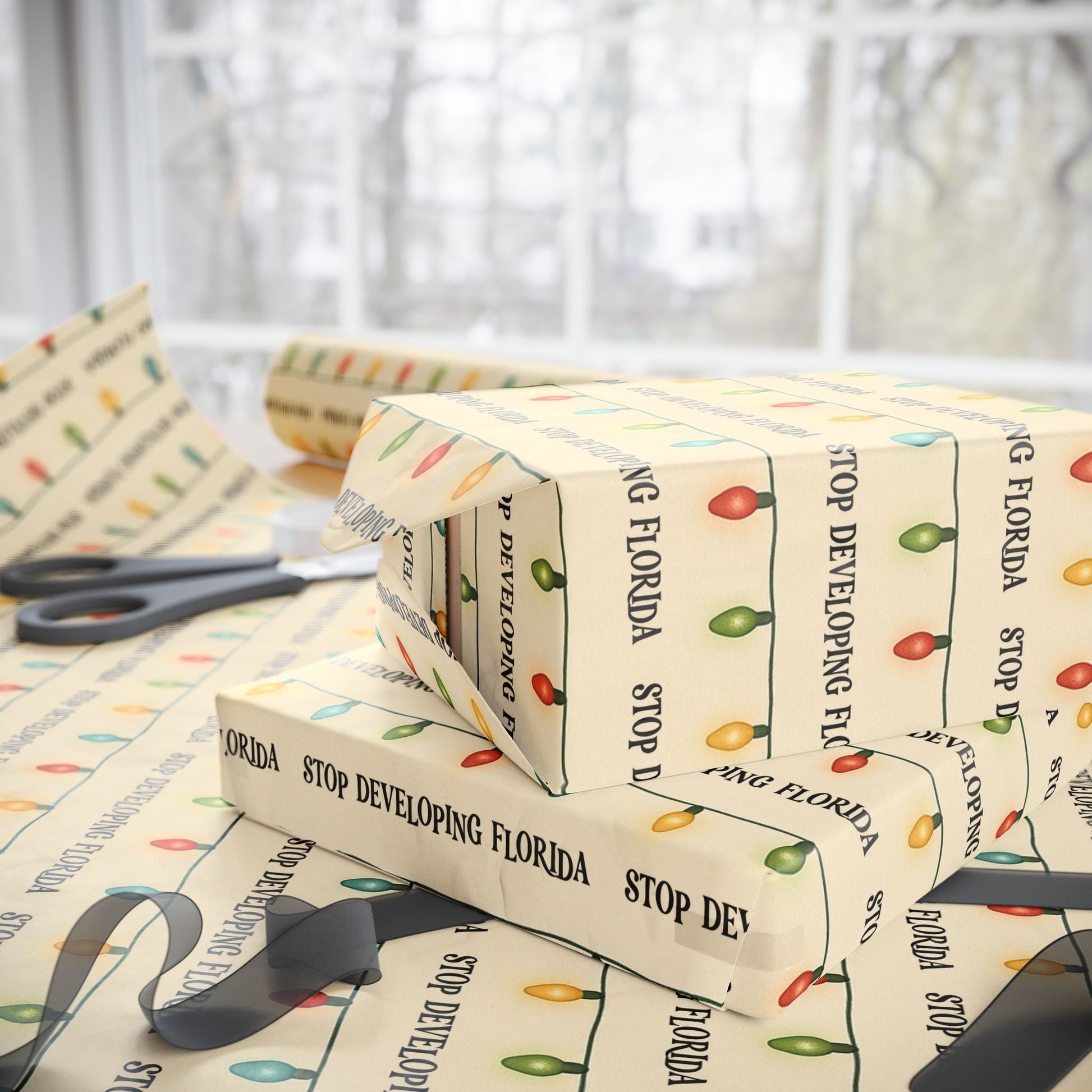 Wrap your gifts with purpose. Clean, high-contrast lines of the STOP DEVELOPING FLORIDA slogan, accented with vintage-style holiday lights for a festive punch.🌴🎁✨