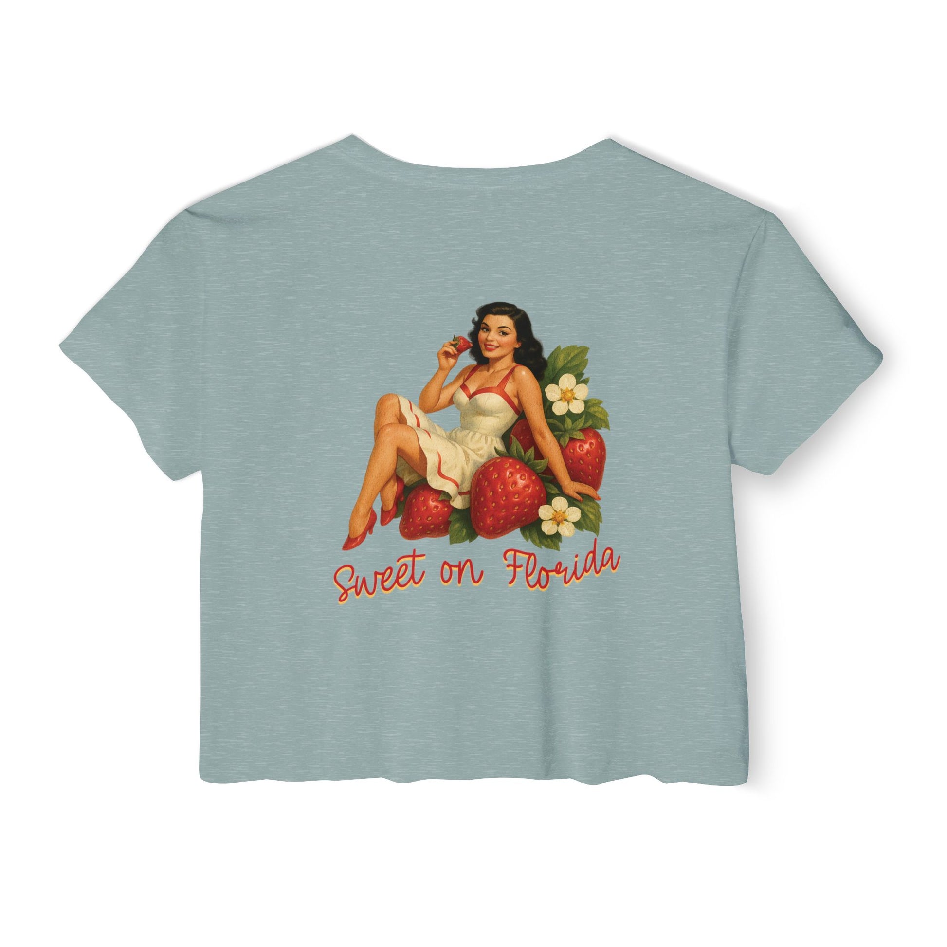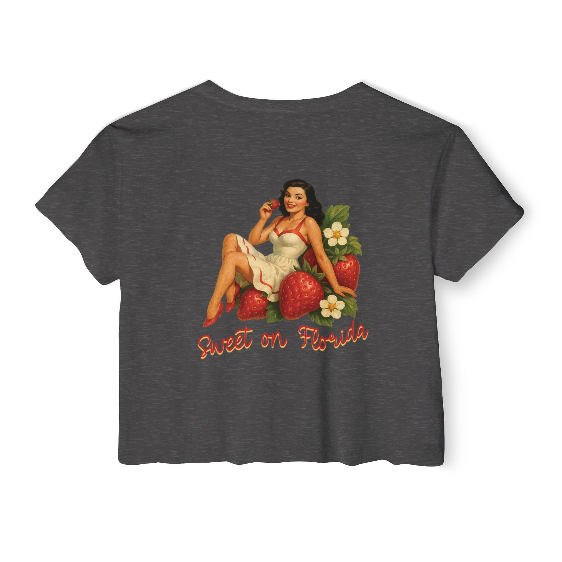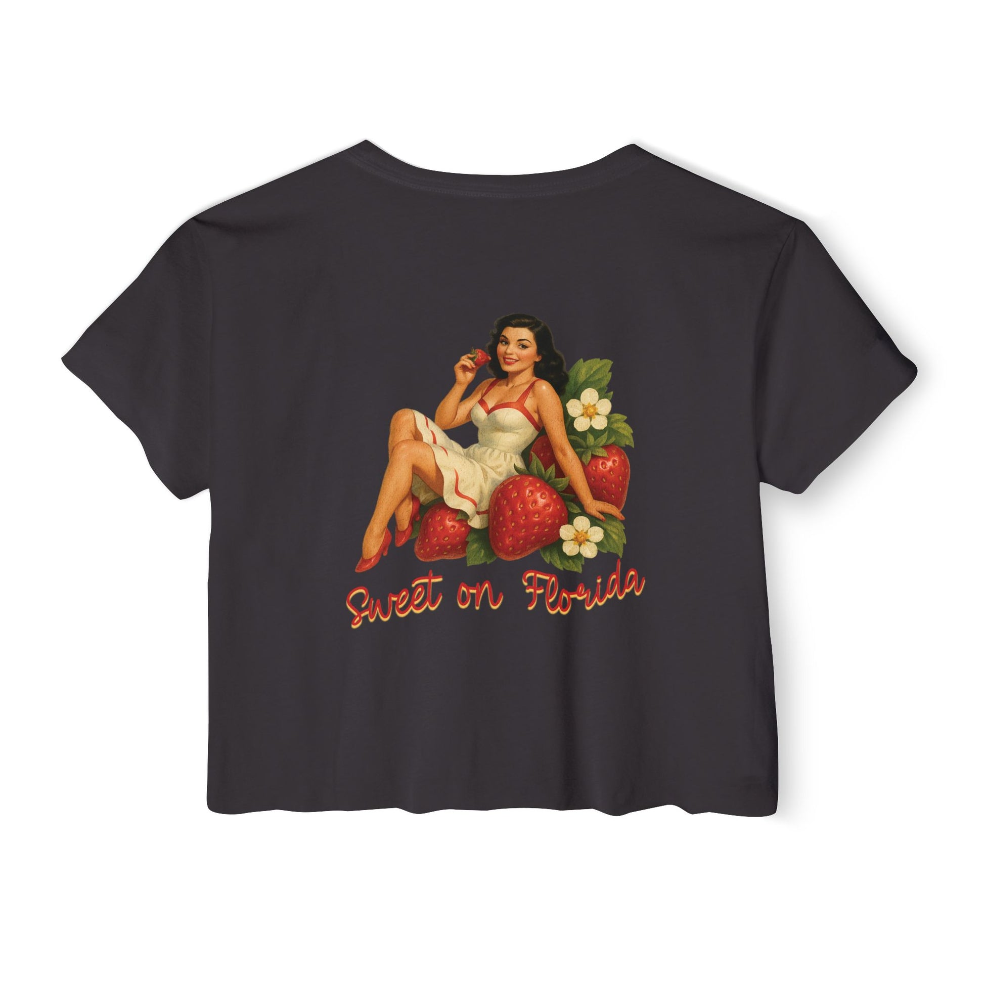 Step into sunshine with the Sweet on Florida Crop, part of our Florida Pinup Series. This retro-inspired design captures a glamorous belle among ripe strawberries and blossoms, paired with the playful tagline “Sweet on Florida.” It’s flirty, nostalgic, and dripping with Old Florida charm.