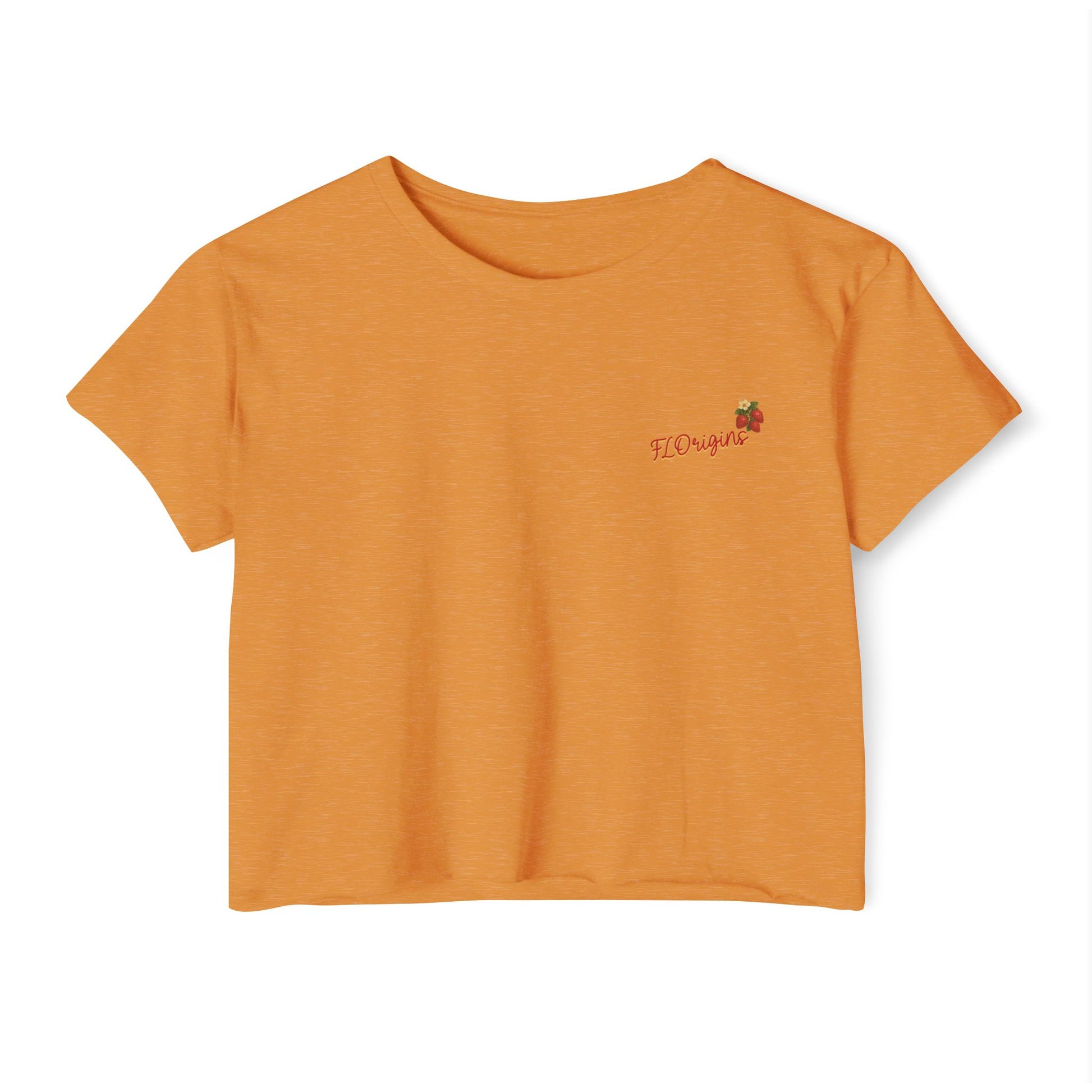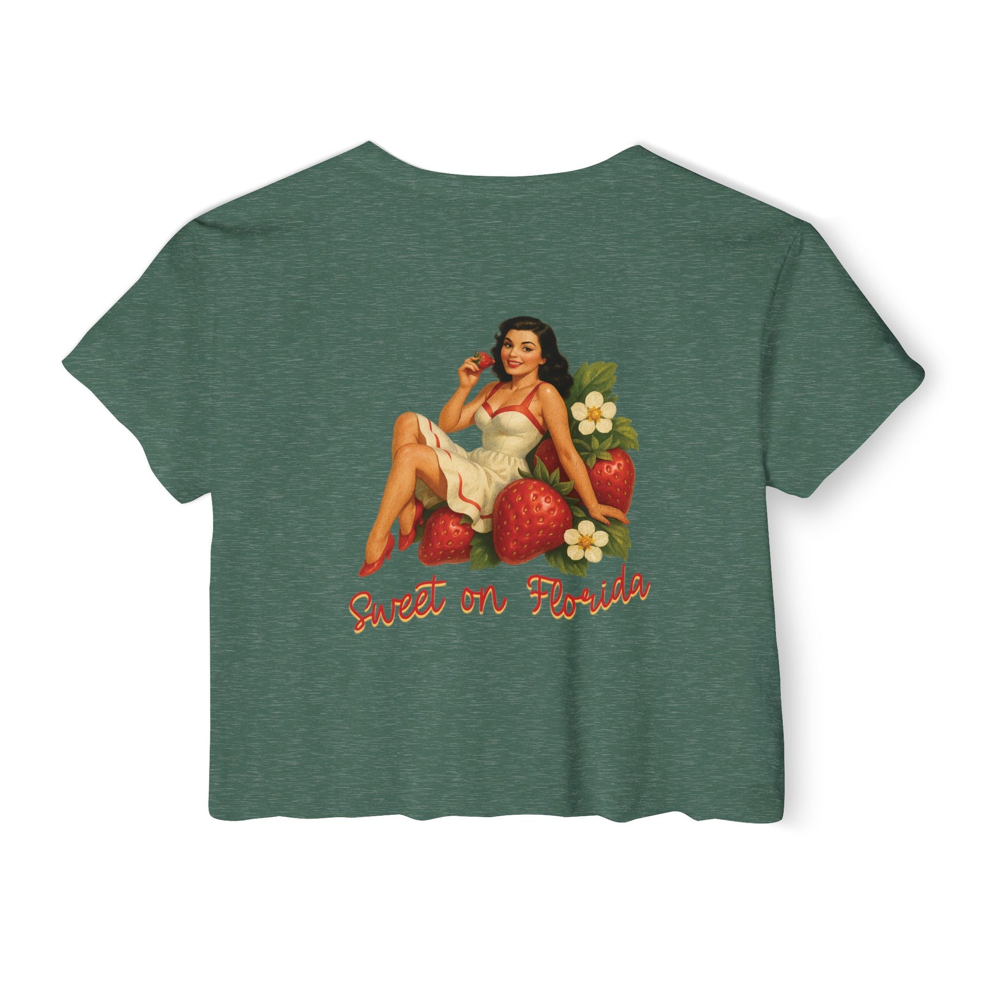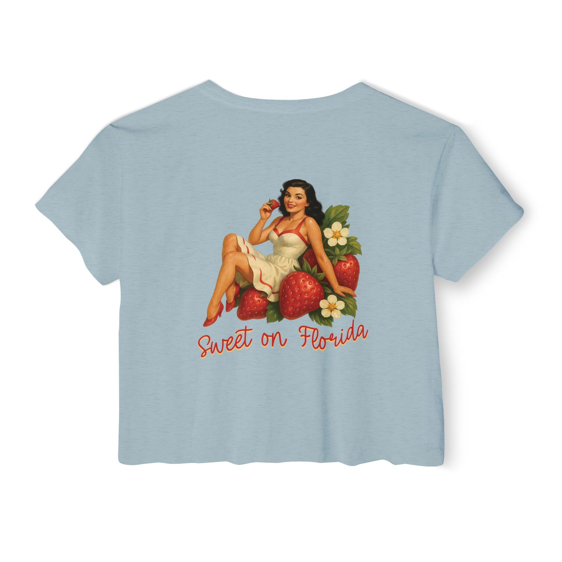 Step into sunshine with the Sweet on Florida Crop, part of our Florida Pinup Series. This retro-inspired design captures a glamorous belle among ripe strawberries and blossoms, paired with the playful tagline “Sweet on Florida.” It’s flirty, nostalgic, and dripping with Old Florida charm.