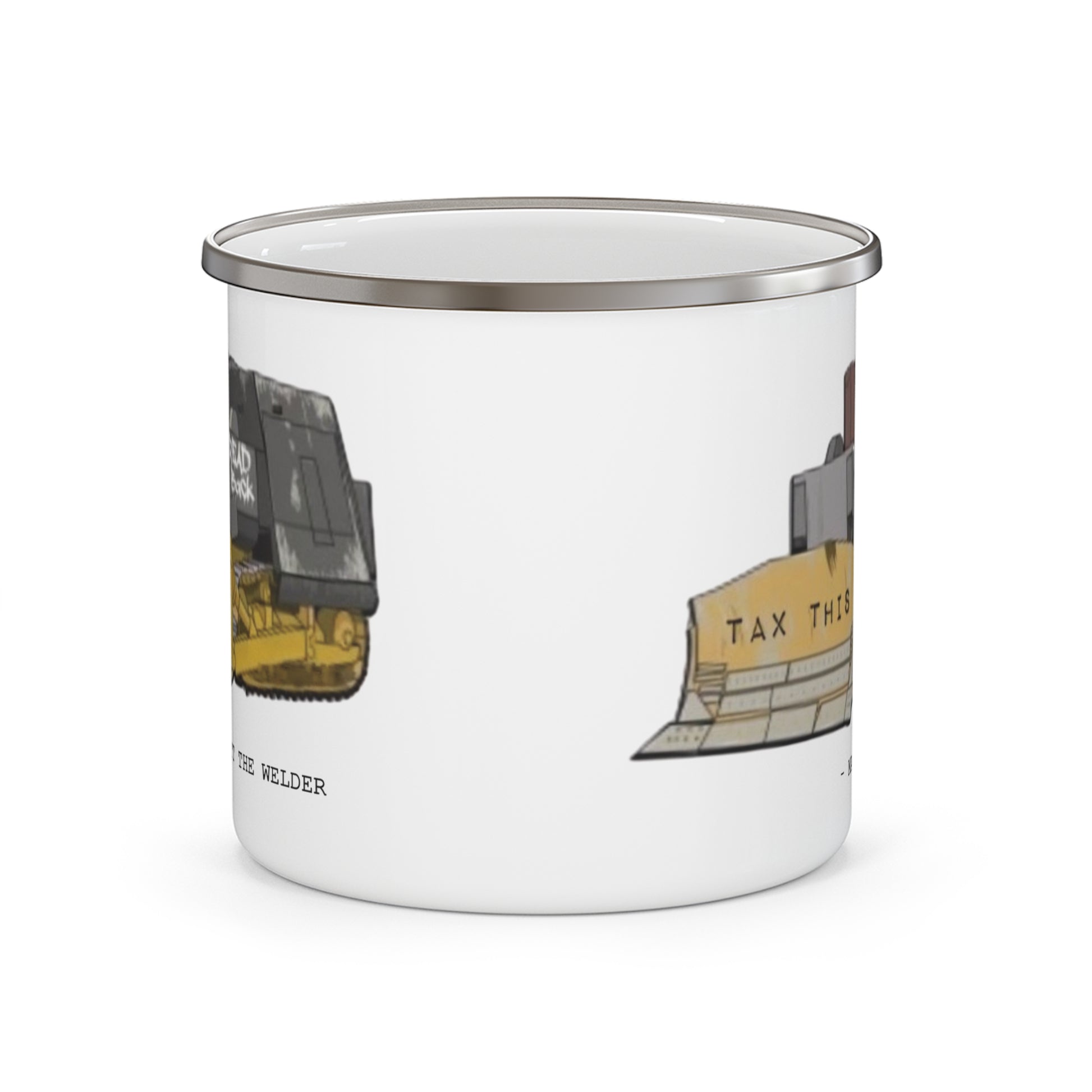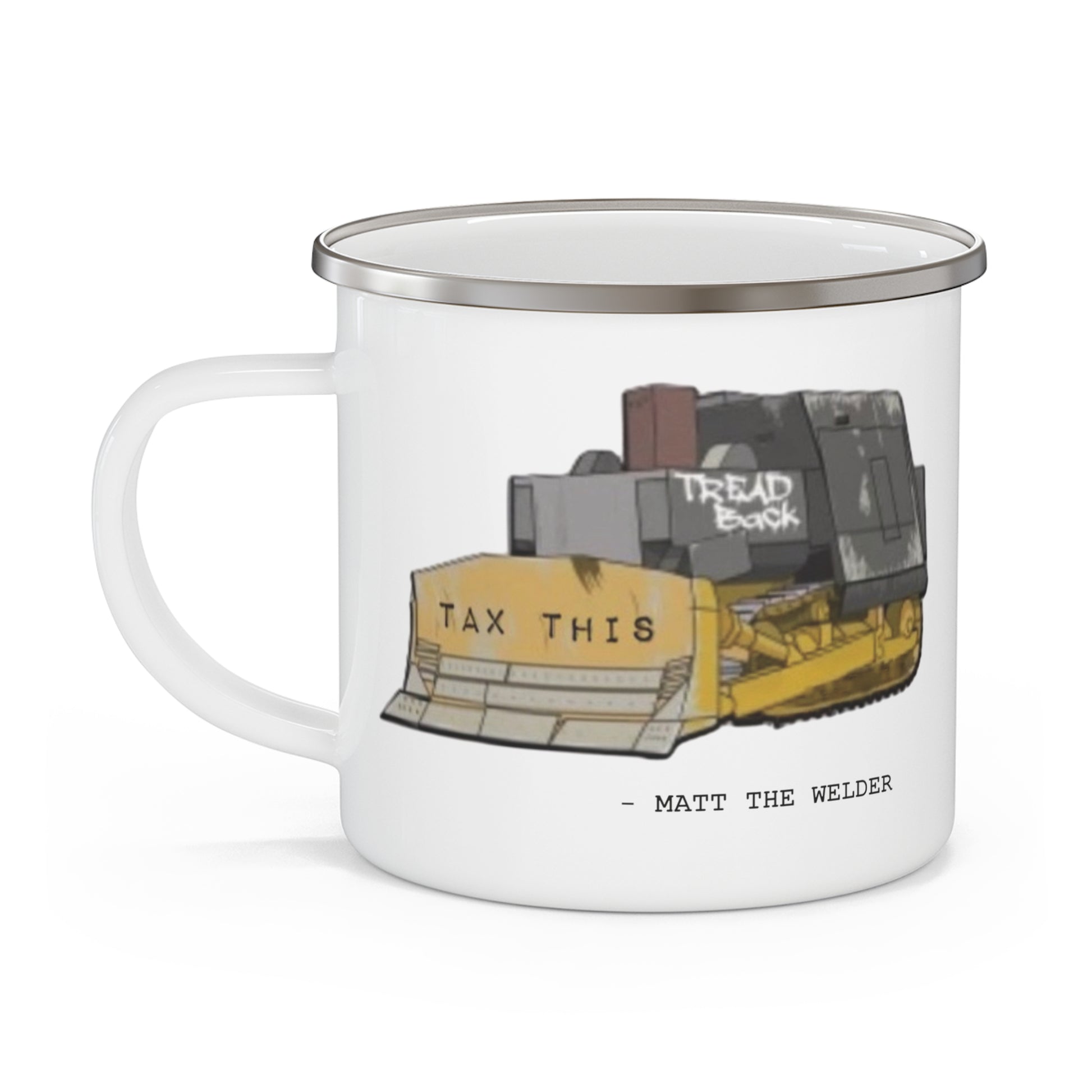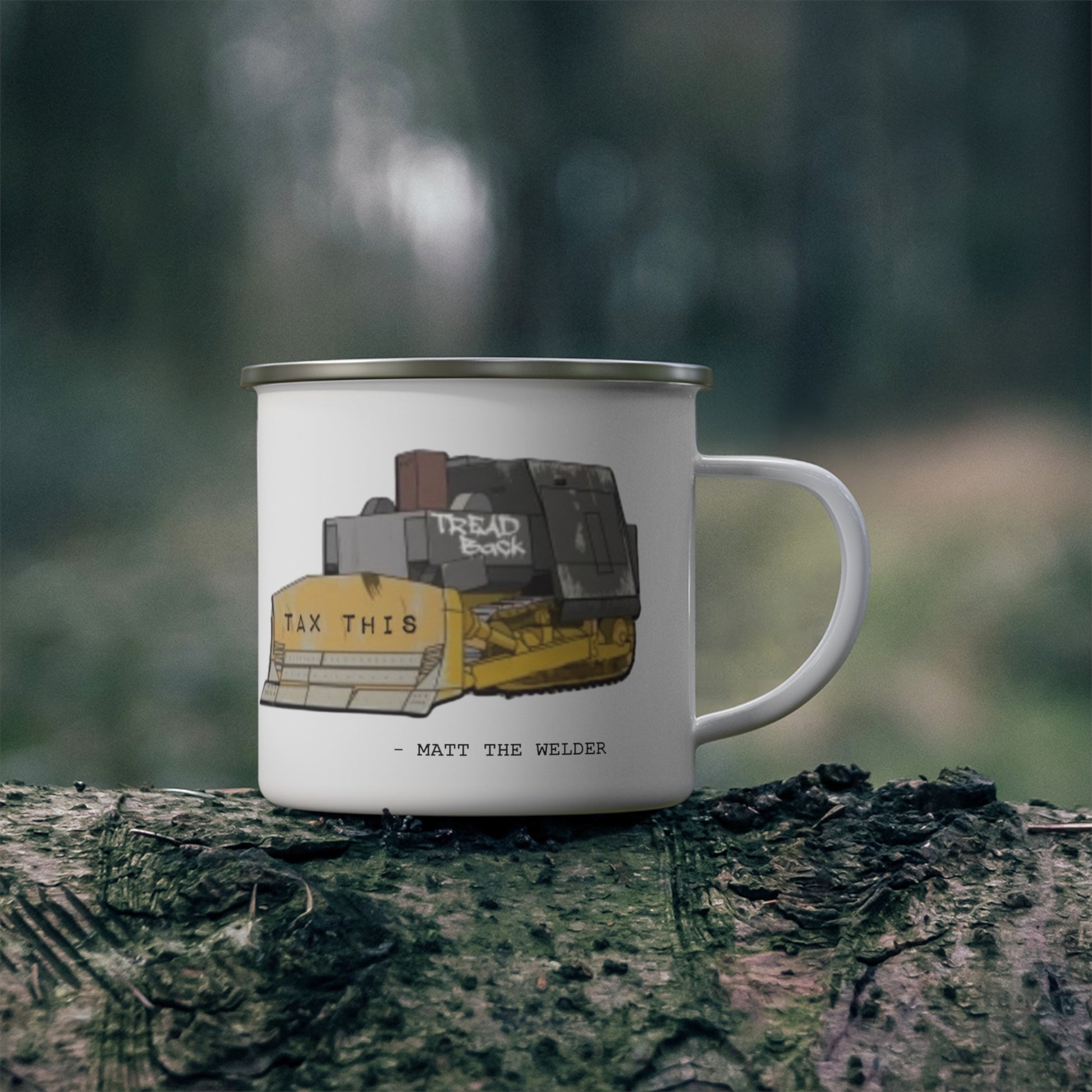 The Tread Back Enamel Mug puts Matt’s cheeky dozer with “TAX THIS” on a camp-ready classic—perfect for the shop, the porch, or the trail.